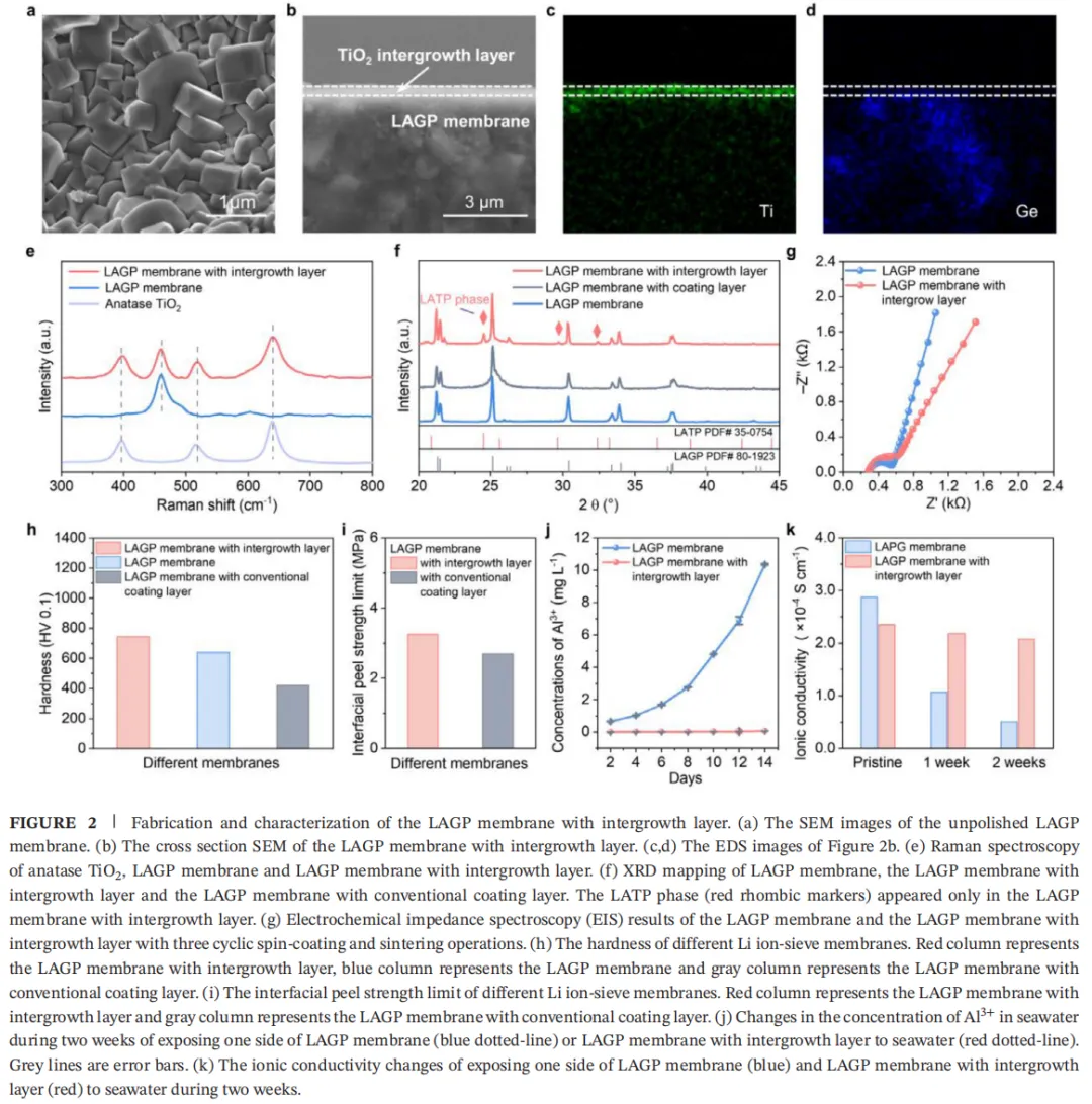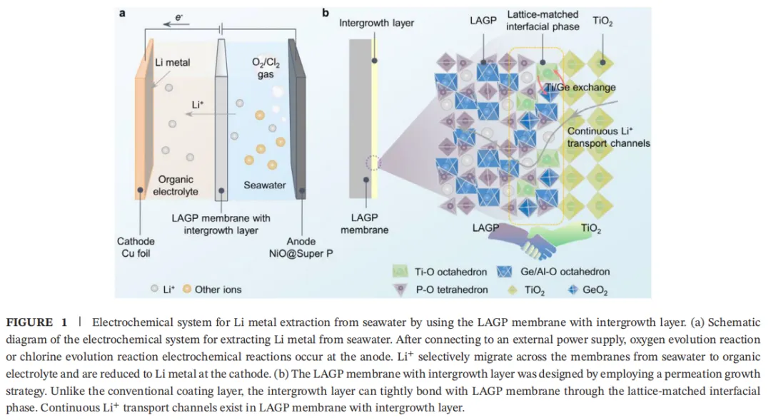 从海水中提取锂可提供额外的锂源,但传统Li1.5Al0.5Ge1.5(PO4)3(LAGP)易被海水腐蚀、常规涂层结合力弱,限制了其应用。本文提出渗透生长策略,在LAGP膜表面构筑TiO2共生保护层,制备出带共生层的LAGP膜,实现海水长效稳定提锂。将酸性TiO2溶胶旋涂于抛光后的LAGP膜并烧结,过程中酸刻蚀与Ti4+/Ge4+离子交换,在致密TiO2共生层下方生成晶格匹配的Li1+xAlxTi2−x(PO4)3/LAGP 界面相。该共生结构消除界面缝隙、提升剥离强度与硬度,同时构建连续Li+传输通道,室温离子电导率达2.40×10−4S⋅cm−1,在海水中化学稳定性优异。将该膜应用于提锂装置,以天然海水为阳极液、有机电解液为阴极液,可稳定运行650小时,保持膜完整性与Li+/Na+选择性,库仑效率 97.4%,能耗17.4 kWh⋅kg−1。该渗透生长策略为构筑兼具化学稳定性与Li+传输性能的共生结构锂离子筛膜提供通用方法,可用于海水提锂。尽管海水锂资源丰富,但Li+浓度极低、干扰离子含量高,传统蒸发–沉淀法难以高效回收锂。近年来,多种直接提锂技术被提出,包括溶剂萃取、吸附、膜分离、电化学分离等。其中,基于锂离子筛膜的电化学分离因锂选择性优异备受关注。锂离子筛膜具有致密晶体结构,既能分隔海水与回收液,又能为Li+提供专属传输通道。因此,该技术具备Li+分离效率高、可有效阻隔干扰离子、操作简便等优势。此外,以有机电解液为回收液时,可通过一步电解直接从海水中提取金属锂。