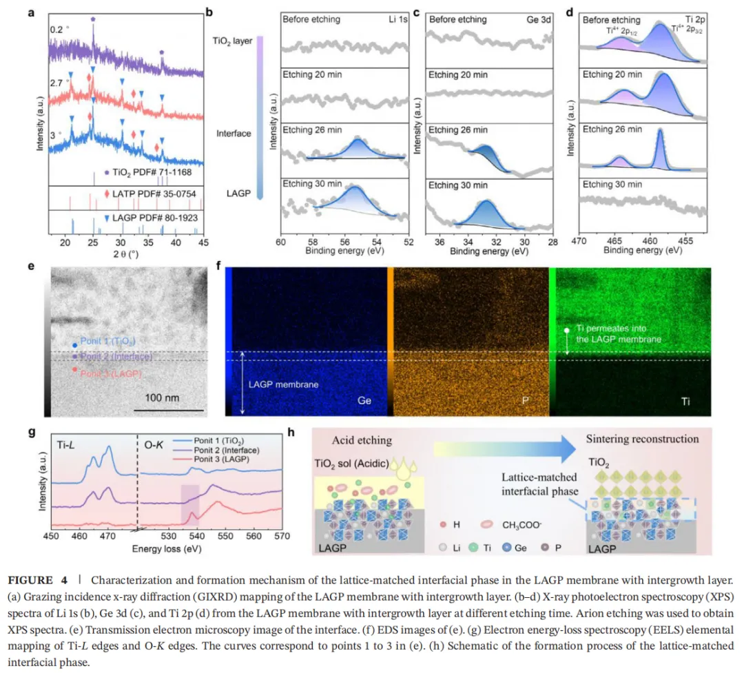 掠入射 X 射线衍射(GIXRD)结果显示,入射角 0.2° 时衍射峰主要来自表面TiO2层;入射角增大后,出现共生结构中LATP与LAGP的衍射峰。X 射线光电子能谱(XPS)分析元素信号随刻蚀时间的变化:短时间刻蚀时,信号以TiO2层的Ti、O为主;刻蚀26分钟时,Li、Ge、Al、P 信号与 Ti、O 信号同时出现,证明界面为含晶格匹配LATP相的化学梯度多相区;继续刻蚀,Ti 信号消失,信号以LAGP膜元素为主。TEM 与EDS面分布进一步证实,晶格匹配界面区域厚数十纳米,Ti 与 Ge 元素共存,Ti向LAGP膜内部渗透。电子能量损失谱(EELS)元素面分布显示,Ti信号从TiO2层向界面逐步减弱,最终在 LAGP 区消失;O-K 信号表明界面存在氧空位,可促进Li+快速传输。