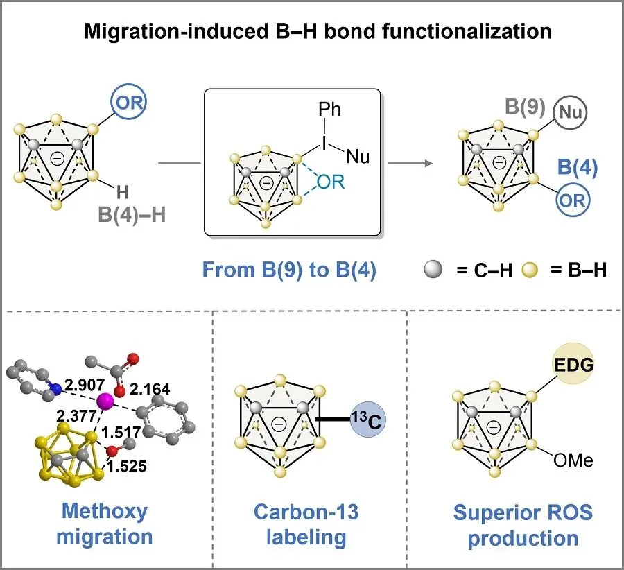 近日,南京大学燕红教授、涂德双副教授与西班牙赫罗纳大学Miquel Solà教授、巴塞罗那大学Jordi Poater教授合作,开发了一种基团迁移策略,该策略能够实现B(9)–烷氧基向相邻B(4)–H键的迁移。在该策略中,高价碘(III)试剂可在杂环或硫醚等亲核试剂存在下诱导烷氧基发生迁移,从而实现巢式碳硼烷的B(4/9)–H键双官能团化。基于该反应方案,设计并合成了新型13C标记硼递送剂,以及具有聚集诱导发光特性和高效活性氧生成能力的巢式碳硼烷基发光材料。
