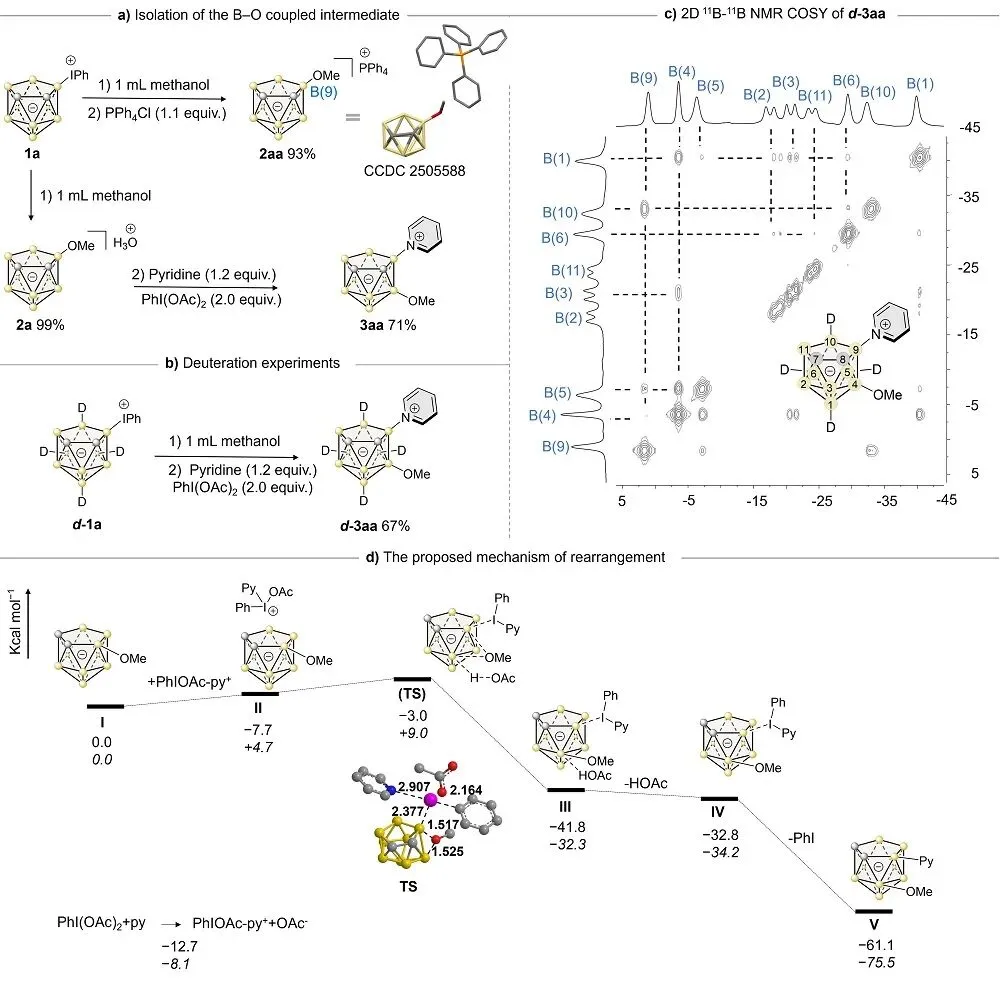 在探究迁移反应机理时,使用了四苯基氯化膦进行阳离子交换,通过单晶X射线衍射分析,证实第一步反应中B(9)位取代产物的生成(图2a)。为进一步阐明反应机理,合成了氘代巢式碳硼烷d-1a,在标准条件下进行后续反应,获得了氘代产物d-3aa(图2b)。产物d-3aa的二维11B-11B NMR COSY谱图表明硼笼上硼原子位置未发生变化(图2c)。因此,排除可能的涉及三角面旋转和菱形-正方形-菱形重排机理。取而代之,作者提出了一个涉及甲氧基团从B(9)顶点直接迁移至B(4)顶点的机理,该机理得到了理论计算的支持(图2d)。由于甲氧基对硼笼的吸电子诱导效应,亲核反应优先在B(9)位发生,导致该位点形成超配位硼结构,进而引发后续的迁移反应。在B(4)位缺电子性质的驱动下,甲氧基优先迁移至该位点,最终得到B(4)和B(9)位双取代产物。