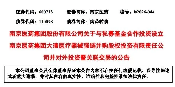 近日,A股上市企业南京医药发布公告称,公司拟参与设立一支专项并购基金——南京医药集团大清医疗器械强链并购股权投资有限责任公司(暂定名)。