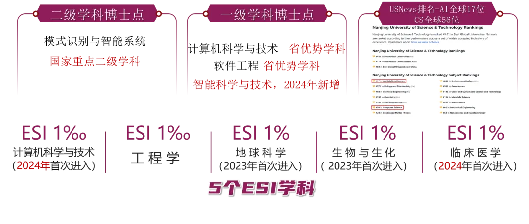 南京理工大学计算机科学与工程学院(人工智能学院、软件学院)拥有国内一流学科、一流科研平台、一流师资和一流专业。现有 “模式识别与智能系统” 国家重点学科、“计算机科学与技术” 和 “社会公共安全技术” 江苏省优势学科,“软件工程” 江苏省一级重点学科,“模式识别与智能系统” 国防特色一流学科、“社会公共安全信息工程” 工信部重点学科,其中计算机科学学科为全球 ESI 前 1‰学科。US.News 排名上升至全球第 64 位,人工智能学科上升至全球第 17 位。另外学院作为学校的核心力量支撑了计算机科学和工程学两个 ESI 前 1‰学科,以及地球科学、生物与生化和临床医学三个 ESI 前 1% 学科。