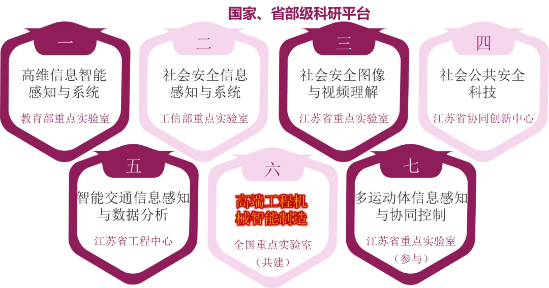 学院拥有 “高端工程机械智能制造” 全国重点实验室、“高维信息智能感知与系统” 教育部重点实验室、“社会安全图像与视频理解” 江苏省重点实验室、“光谱成像与智能感知” 江苏省重点实验室,“社会安全信息感知与系统” 工信部重点实验室、“语言信息智能处理及应用” 工信部重点实验室、“社会公共安全科技” 江苏省 2011 协同创新中心,“高维信息智能感知与系统” 国际合作基地等。