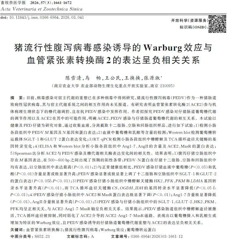 PEDV感染诱导仔猪肠道组织发生以葡萄糖摄取增强和乳酸堆积为特征的Warburg效应,表现为糖酵解途径激活、TCA循环抑制,且该代谢重塑与ACE2-Ang1-7-MasR通路下调呈负相关关系。ACE2介导的通路可能参与调控PEDV感染诱导的葡萄糖代谢过程,为深入理解PEDV致病机制及探索代谢干预靶点提供了理论依据。