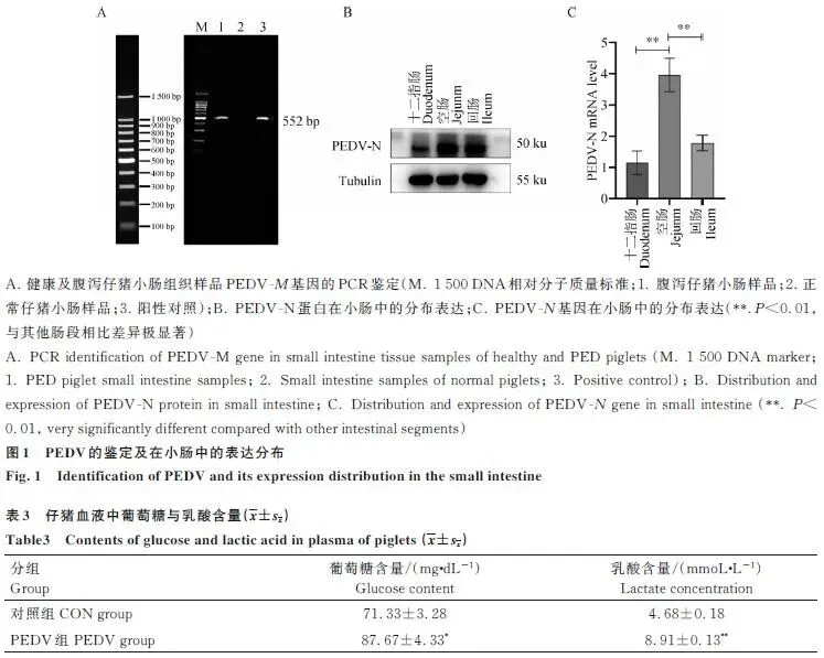 1.1.2 试验动物及样品采集 PEDV阳性腹泻仔猪3头(试验组)和日龄相近健康仔猪3头(对照组),采集血液及十二指肠、空肠、回肠组织样品。
