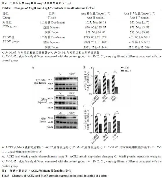 2.6.1 AngII和Ang1-7含量 PEDV组十二指肠、空肠、回肠Ang1-7含量极显著降低(P<0.01),Ang II含量极显著升高(P<0.01),Ang II/Ang1-7失衡(表4)。