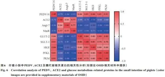 2.7 PEDV感染与肠道ACE2-Ang1-7-MasR通路、葡萄糖转运蛋白及糖酵解关键酶蛋白表达的相关性分析