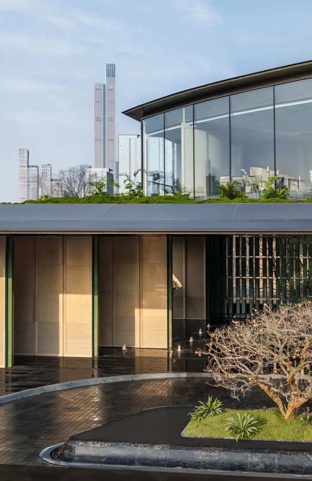 他们在大门二层打造了一个“凤凰台”,用弧形曲面玻璃收揽了更多的风景。当你坐在“凤凰台”中,屋顶起伏的绿茵,又跟窗外的公园连成一片。这样一座楼盘大门,不仅恰如其分地楔入了街道与绿意,更是在绿意中映照着河西CBD的摩天大楼。