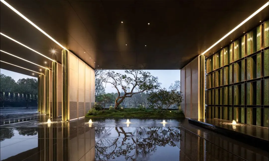 镶嵌在门扇上的绿色陶板,有着琉璃般的质感。它专门烧制出了独属于凤起潮鸣的“凤翎斑”。他们巧妙地将河岸上的风景,框进了大门里,让树影宛如微风一般,吹拂到你面前。对,他们创造性地把大门做成了一个迷人的“灰空间”,让你如沐春风地步入约10米挑高的大堂。