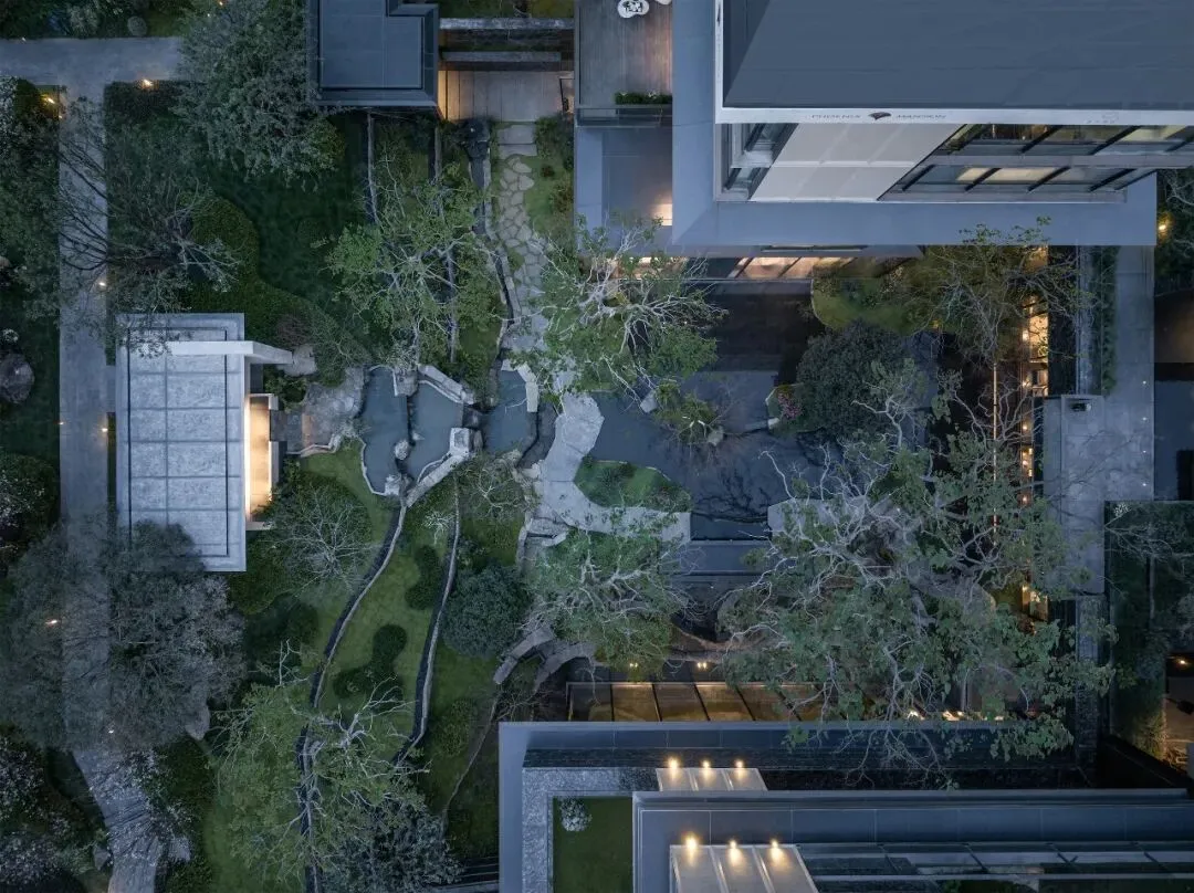 辽阔的公园通过下沉式庭院的水院,一路延续到了行政酒廊的这张座位上。这大概就是李渔在南京芥子园所说的“芥子纳须弥”。这个下沉式庭院它并不是孤立的存在,而是跟红线外的河岸实现了一体化设计建造,让城市更美,让绿意更有质感地环绕着这个容积率仅有1.01的楼盘。