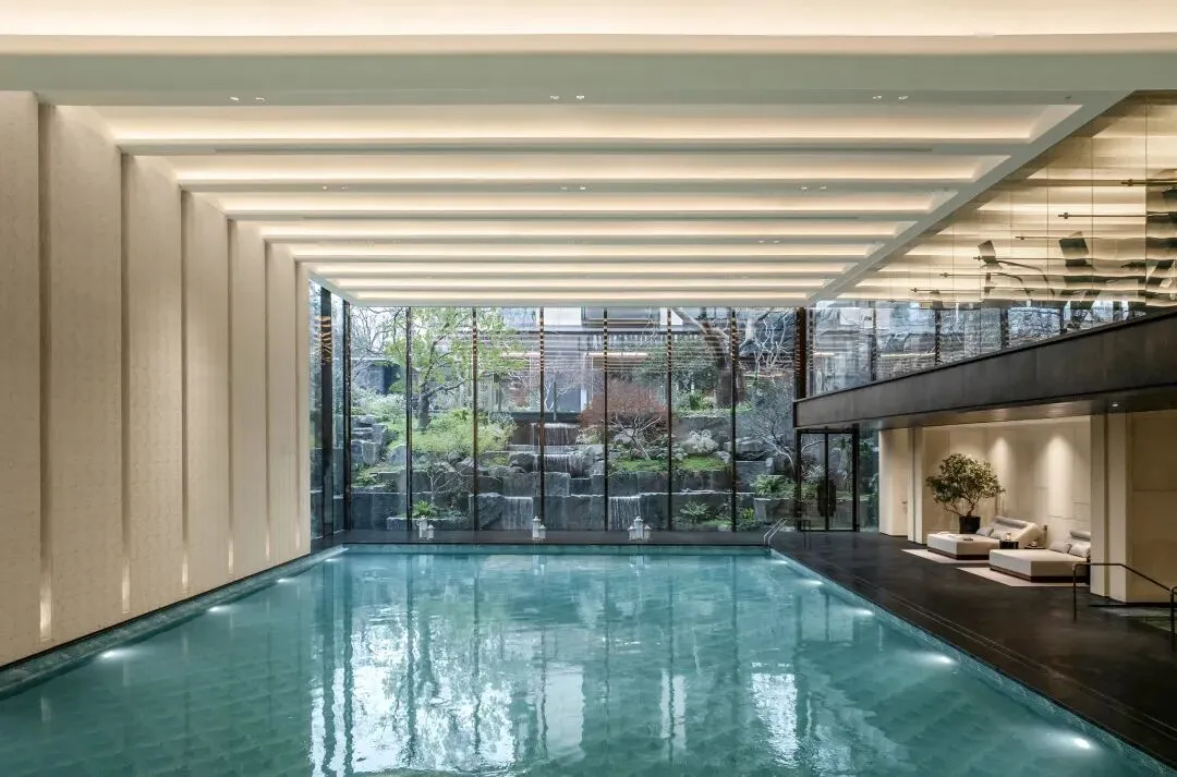 他们把下沉式庭院变成一幅画,完整地映照在室内恒温泳池里。这个泳池会让你产生更强烈的游泳冲动。第一,他们是把窗外的风景放在泳道的前方,而不是侧方,当你向前游去,就更有游向大自然的感觉;第二,他们做了约7.8米的挑高,更空旷;第三,泳池放水也是一门小专业,很多楼盘往往是少放了几公分的水,结果让泳池感觉像是水坑;泳池的水一定要漫出来,才能更激发你游泳的欲望。
