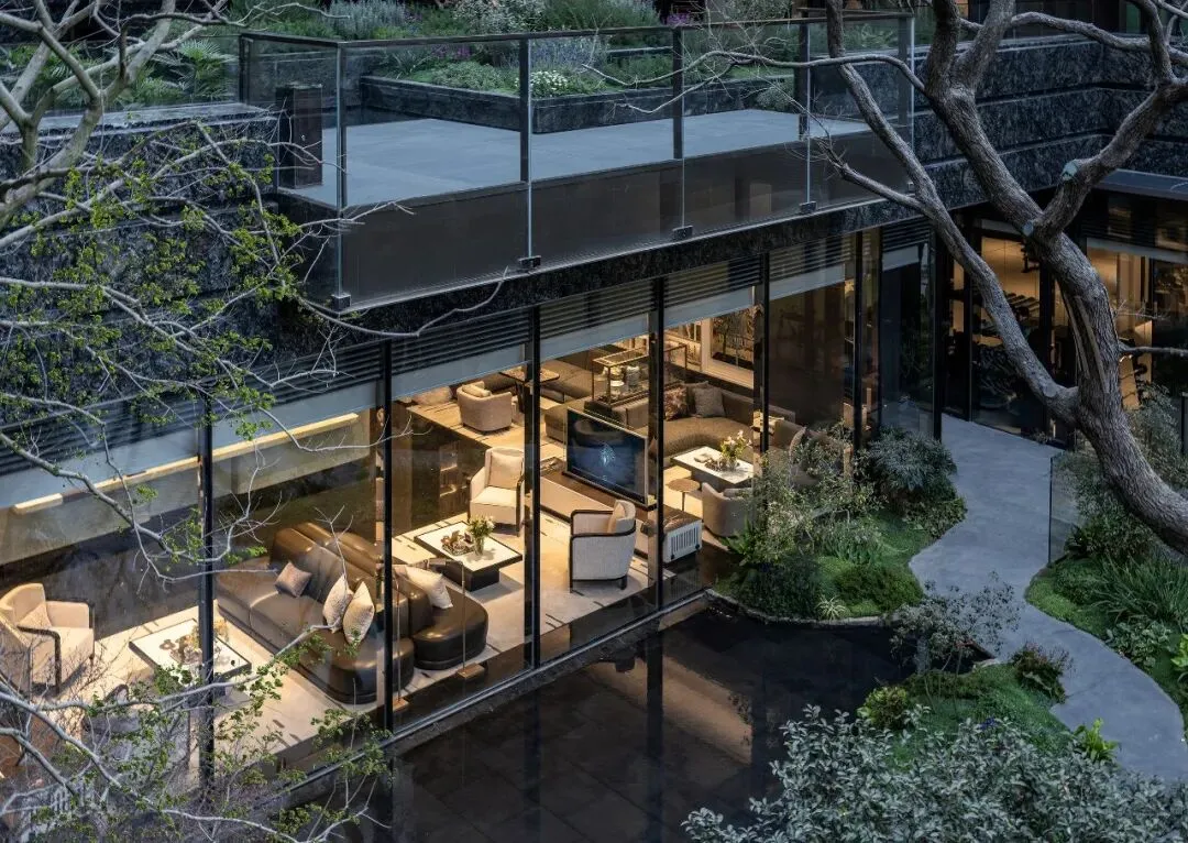 把红线外的河岸与楼盘内的下沉式庭院进行一体化设计建造。南京河西国际友谊公园约21.7公顷的无尽绿意,通过一个镶嵌在楼宇之间的下沉式庭院,一路延续到凤起潮鸣灯光最迷人的那张座位上。整座城市的绿意仿佛都已经聚拢在你身旁,这大概就是李渔在南京芥子园所说的“芥子纳须弥”。