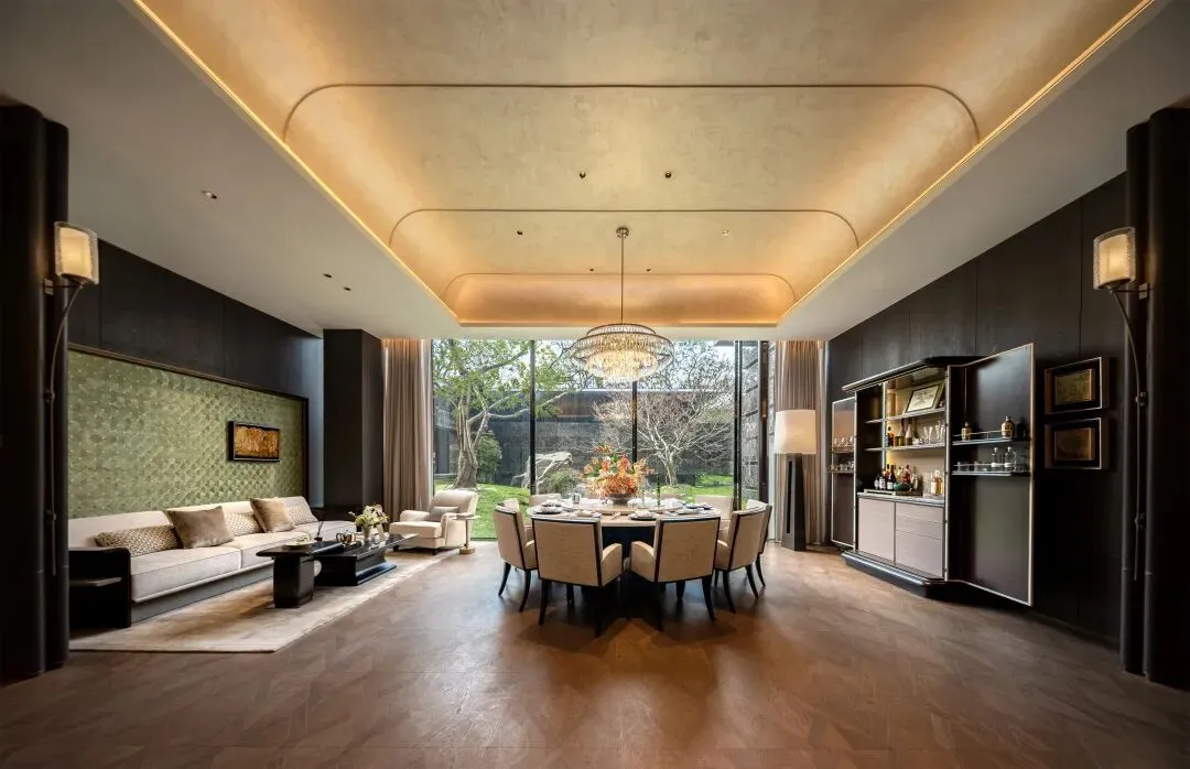 走进“金镶玉”的院门,我们就来到了凤起潮鸣的合院产品。树影与春雨让屋檐下的花园宛若李白诗中“绿水藏春日,青轩秘晚霞”的美景。270度大面积采光窗,让客厅更通透,让你的家族宴席更隆重,让觥筹交错更沉醉。餐厅边上的茶叙小空间,更是与花园融为一体。