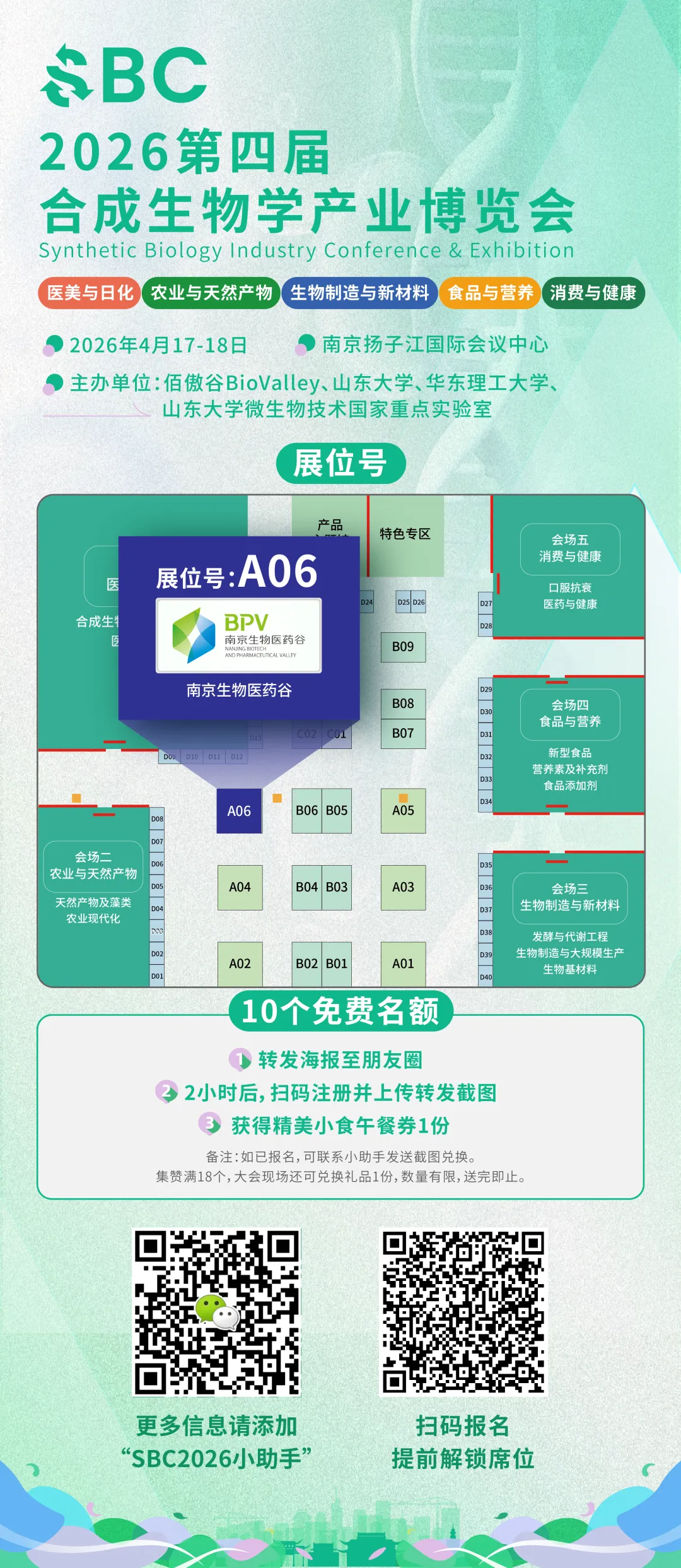 2026第四届合成生物学产业博览会(SBC2026)将于4月17-18日在南京扬子江国际会议中心召开!本届博览以“合成生物未来趋势,智造无限可能”为主题,围绕医美日化、农业与天然产物、生物制造与新材料、食品与营养、消费与健康等内容设置5大会场、13个前沿专题展开深度探讨。
