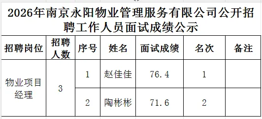 >2026年南京永阳物业管理服务有限公司公开招聘工作人员面试成绩公示
