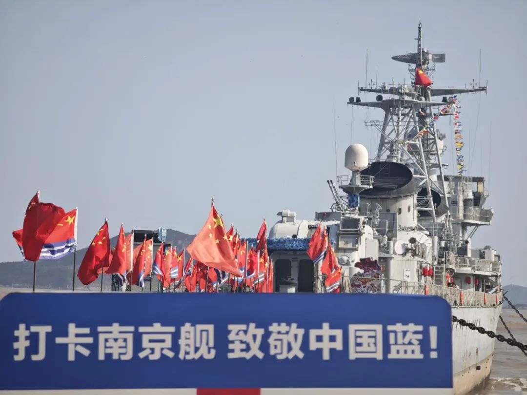 在退役海军/专业教官的带领下,列队登上131南京舰,举行简短的“入列仪式”