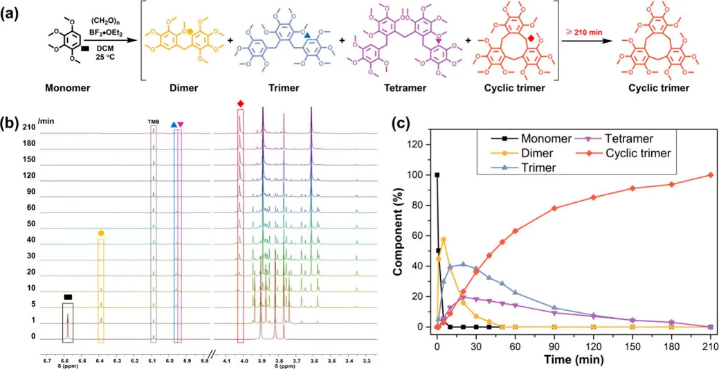 这篇题为An Exclusive Synthesis of Macrocyclic Trimer over Polymers的研究,不仅用 NMR 实时追踪、单晶衍射、DFT 计算全方位解析反应机理,更构建了一套仅生成线性低聚中间体→专一转化为目标大环的理想合成体系,彻底告别传统大环合成的副产物困扰!