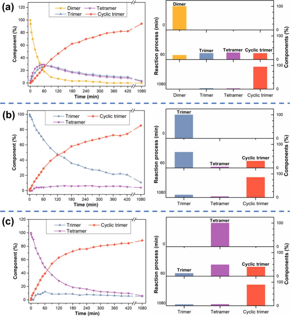 线性二聚体:先转化为线性三聚体、四聚体,最终 94% 生成大环三聚体,无高聚物;