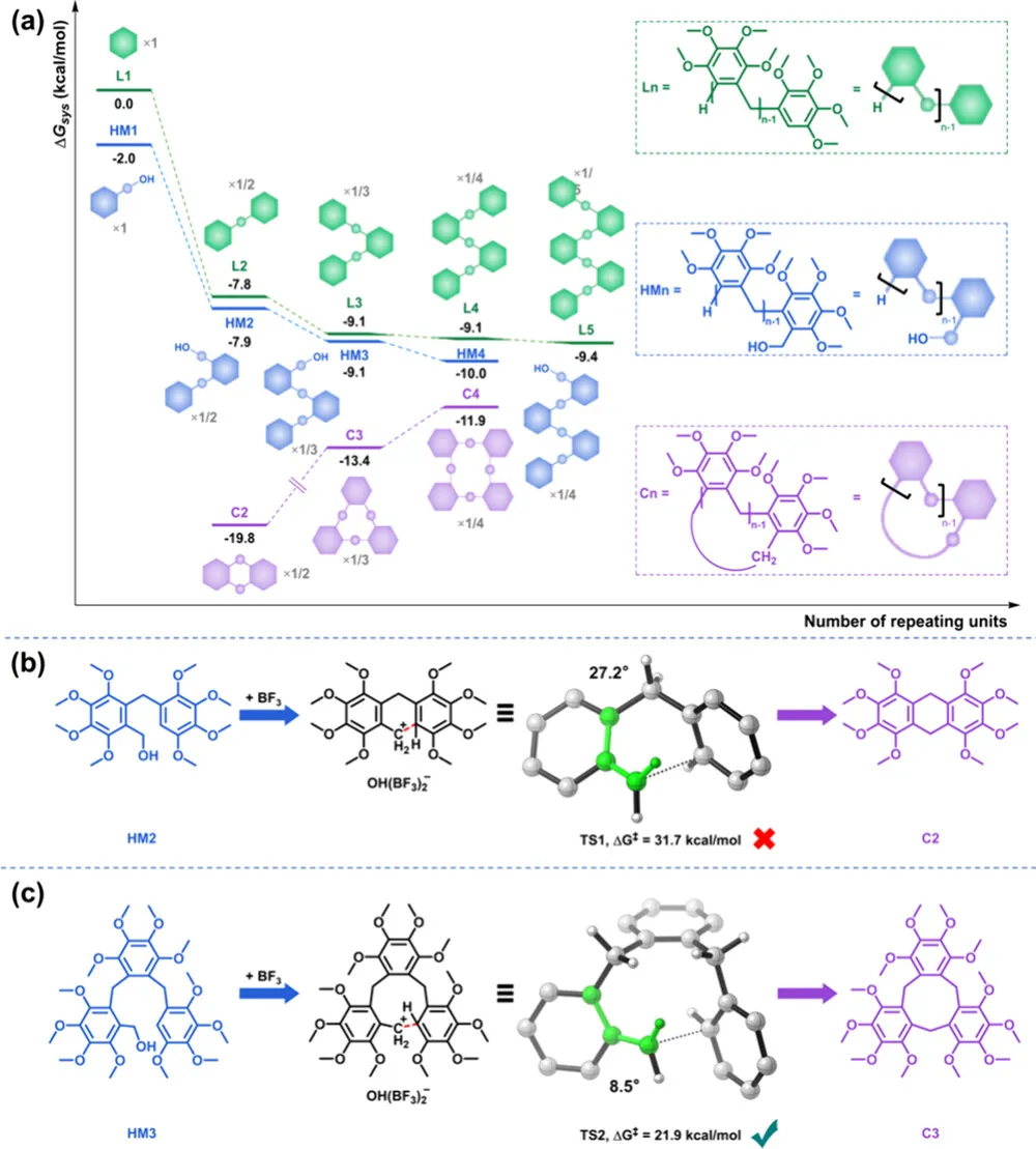 羟甲基三聚体(HM₃)→大环三聚体(C₃):能垒仅21.9 kcal/mol,与链增长能垒相当,环化顺畅发生;