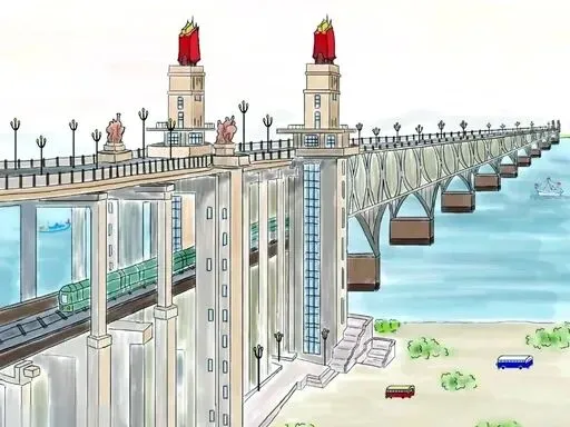 两座工农兵塑像、高耸的桥头堡、整齐的玉兰花灯柱、江上的扁舟、呼啸的火车……