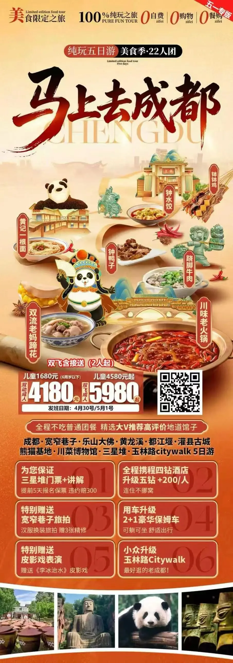 [玫瑰]成都/宽窄巷子/乐山大佛/黄龙溪古镇/都江堰/灌县古城/熊猫基地/川菜博物馆/三星堆/玉林路citywalk 5日游[玫瑰]
