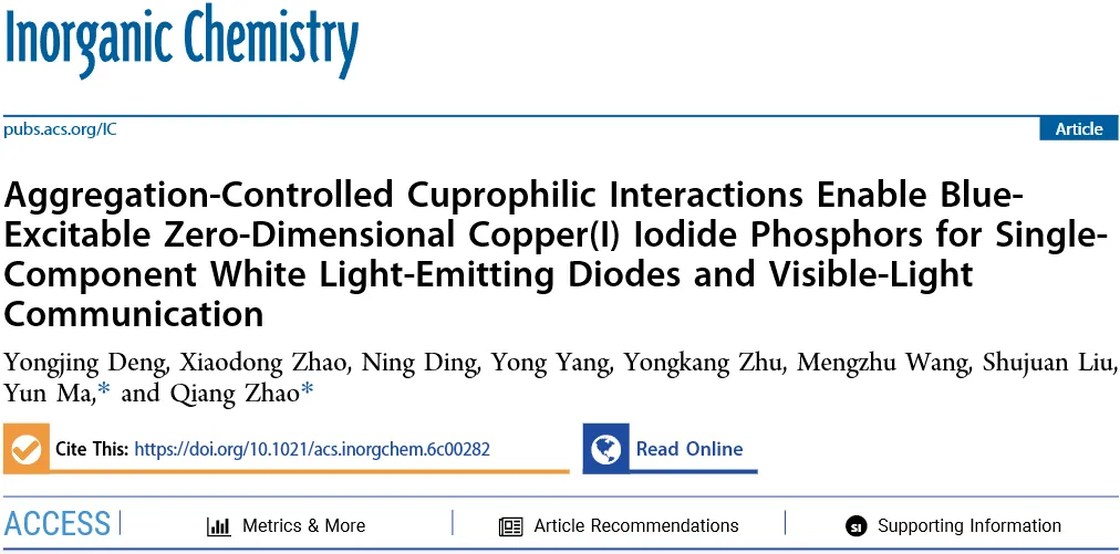南京邮电大学赵强/马云等人Inorg. Chem.:聚集亲铜互作实现蓝光激发零维碘化亚铜磷光:单组分白光LED与可见光通信
