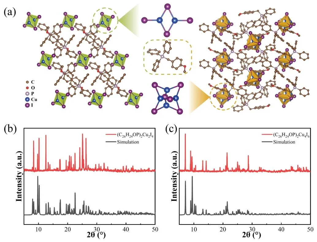 图 1、(a)(C₂₆H₂₄OP)₂Cu₂I₄和 (C₂₆H₂₄OP)₂Cu₄I₆的堆积结构,氢原子为保证图面清晰已省略;(b、c) 分别为 (C₂₆H₂₄OP)₂Cu₂I₄和 (C₂₆H₂₄OP)₂Cu₄I₆的实验(红色)与模拟(黑色)粉末 X 射线衍射图谱;