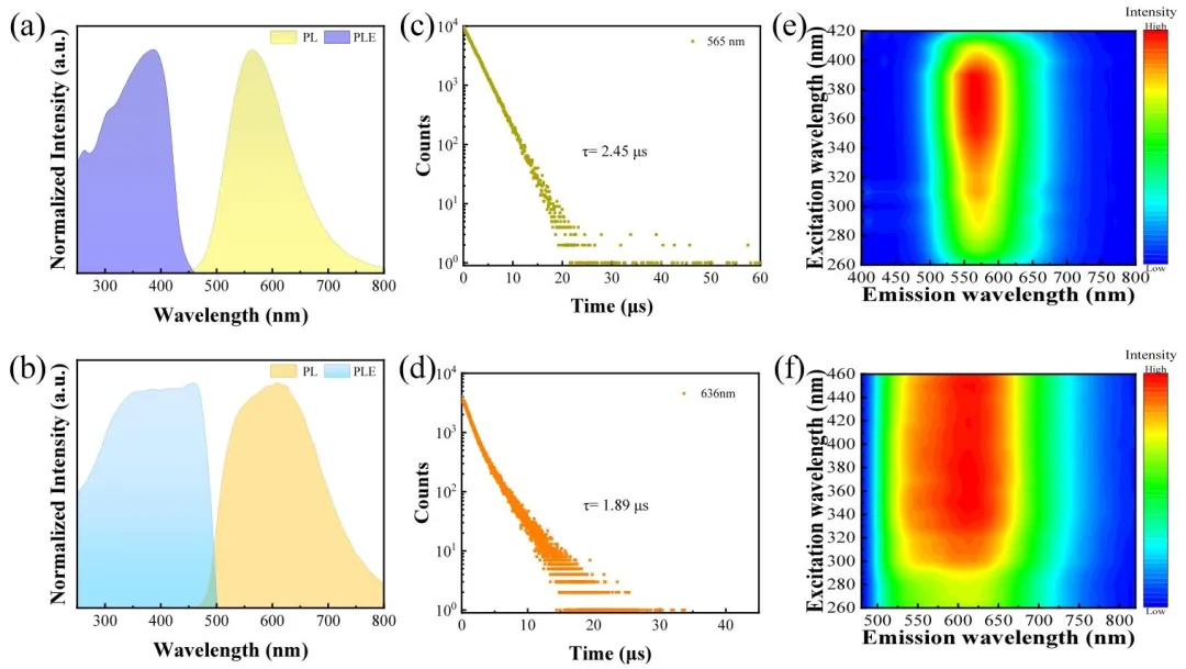 图 2、(a)(C₂₆H₂₄OP)₂Cu₂I₄、(b)(C₂₆H₂₄OP)₂Cu₄I₆的归一化光致发光和光致发光激发光谱;(c)(C₂₆H₂₄OP)₂Cu₂I₄、(d)(C₂₆H₂₄OP)₂Cu₄I₆的时间分辨光致发光衰减曲线;(e)(C₂₆H₂₄OP)₂Cu₂I₄、(f)(C₂₆H₂₄OP)₂Cu₄I₆的激发波长依赖光致发光光谱的伪彩色图谱;