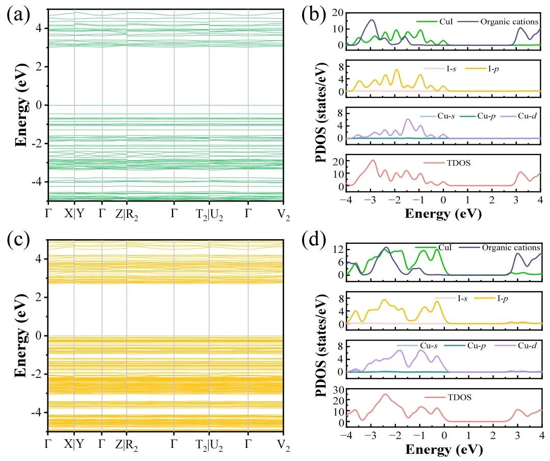 图 3、(a、c) 分别为 (C₂₆H₂₄OP)₂Cu₂I₄和 (C₂₆H₂₄OP)₂Cu₄I₆的计算电子能带结构;(b、d) 分别为二者的总态密度和投影态密度;