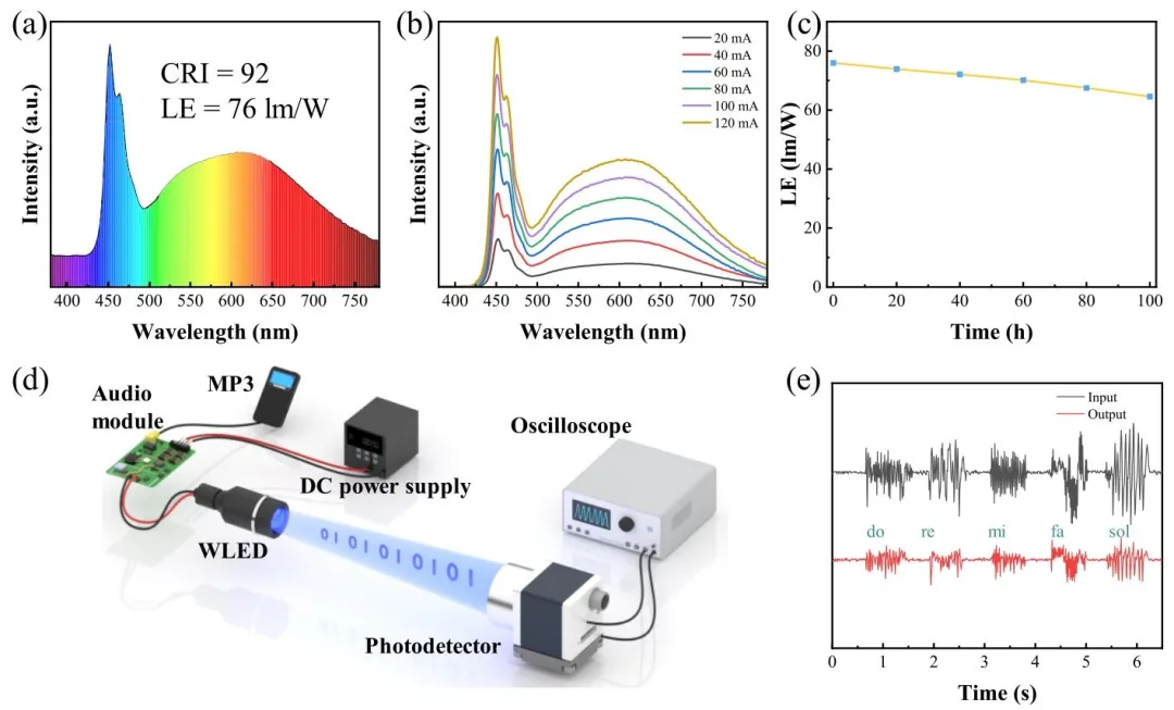 图 4、(a) 电致发光光谱;(b) 驱动电流在 20 至 120 mA 范围内变化时,白光发光二极管的电流依赖电致发光光谱;(c) 恒定 20 mA 驱动电流下,所制备白光发光二极管的工作稳定性;(d) 可见光通信音频传输概念验证的示意图;(e) 输入与输出音频信号波形的对比图,证实了信号的高保真传输。