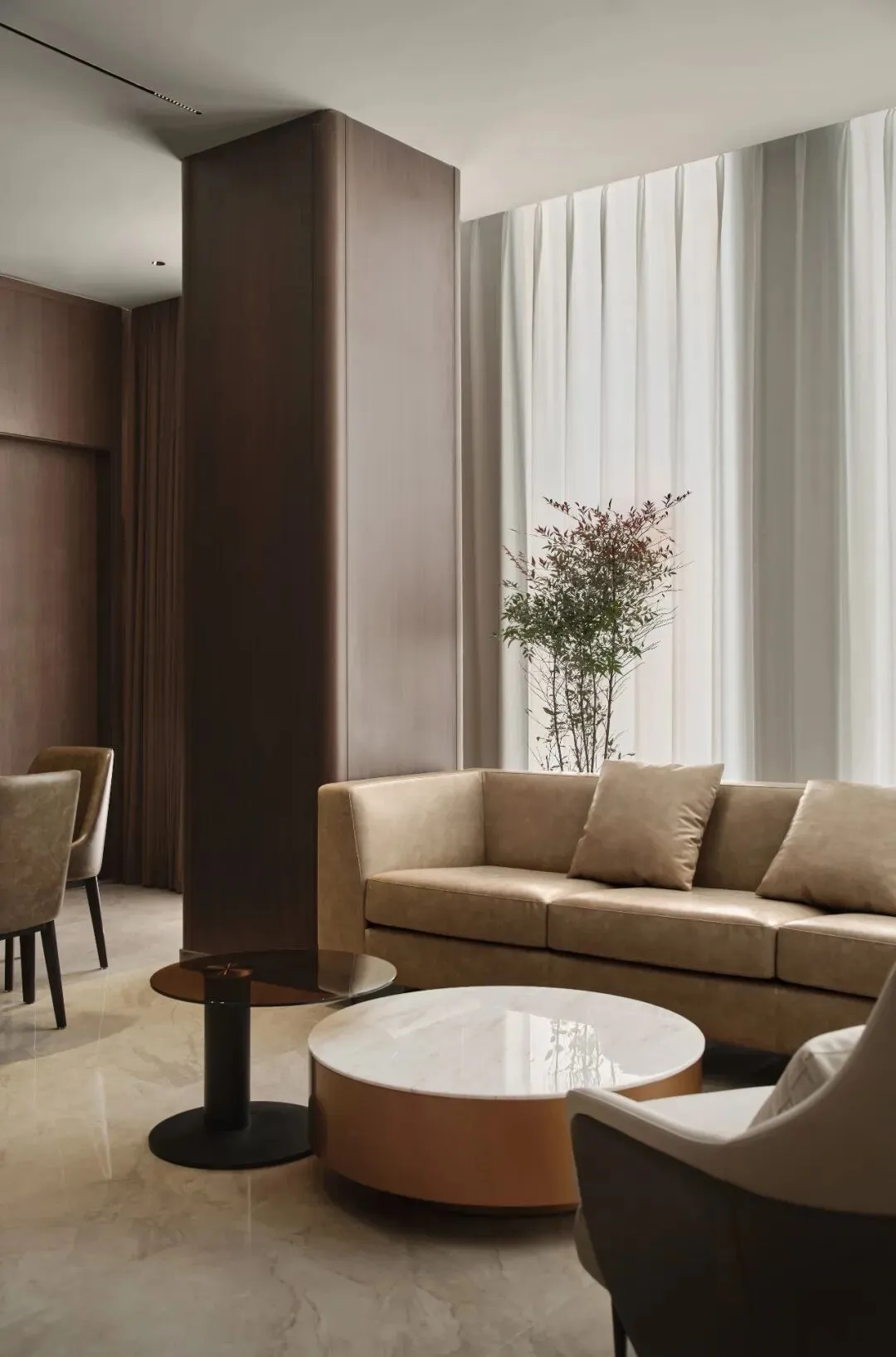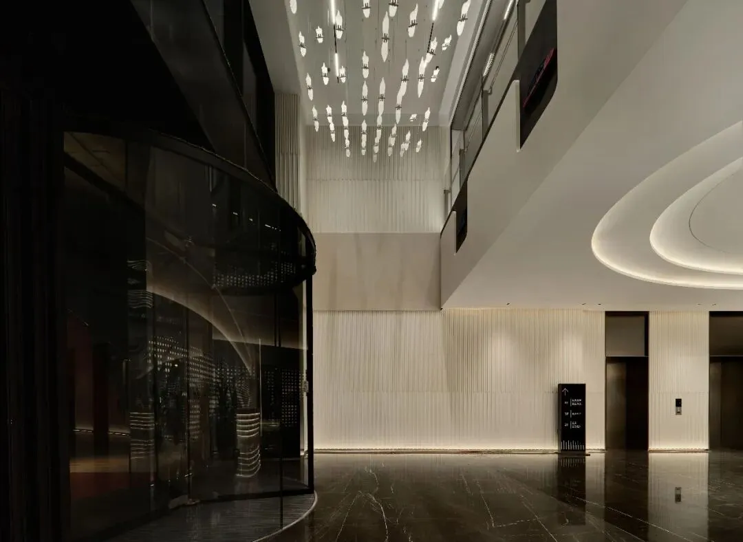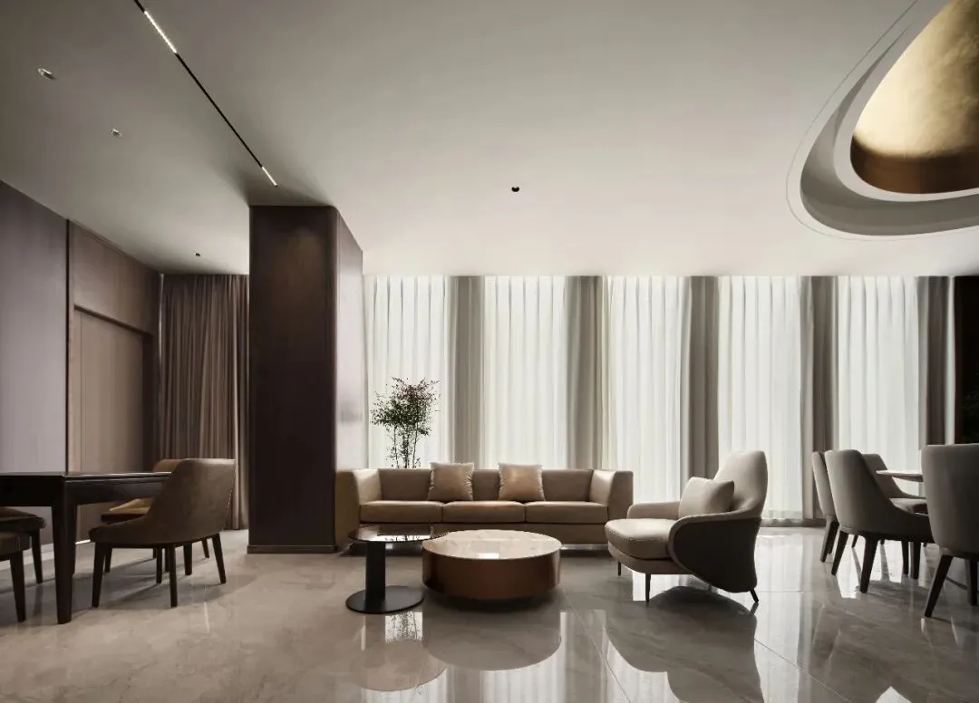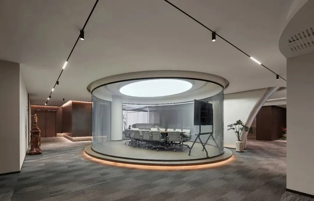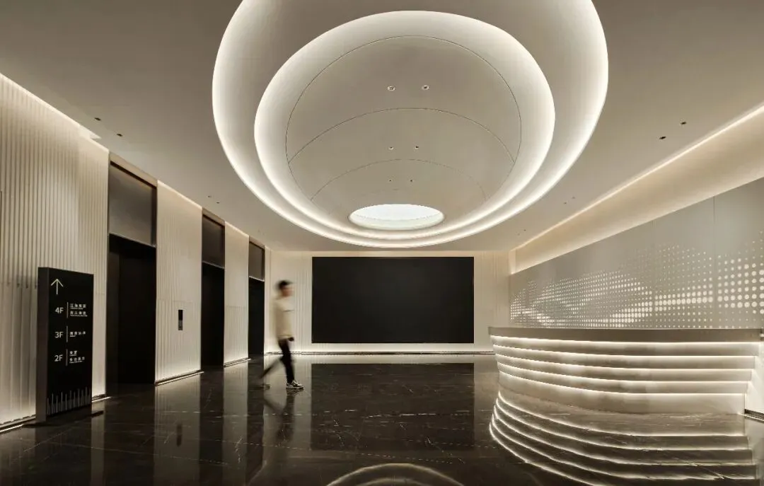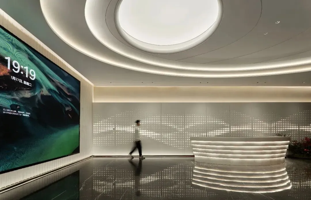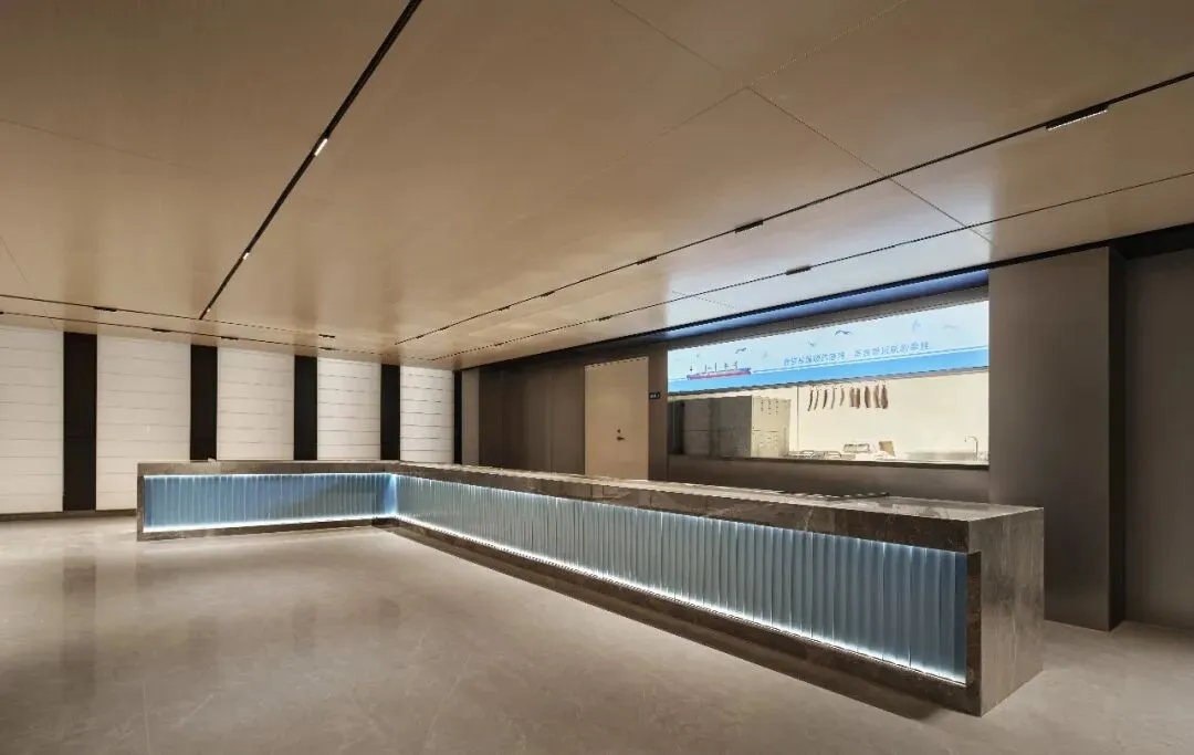 The lobby, serving as the gateway to the corporate image, features a flowing arc that outlines the silhouette of a sail, complemented by minimalist linear lighting and a transparent visual effect, creating an open and expansive ambiance. This design symbolizes the company's journey toward global development. The simple yet sophisticated brand logo and linear decorations on the walls enhance corporate recognition, conveying a professional and trustworthy brand image.