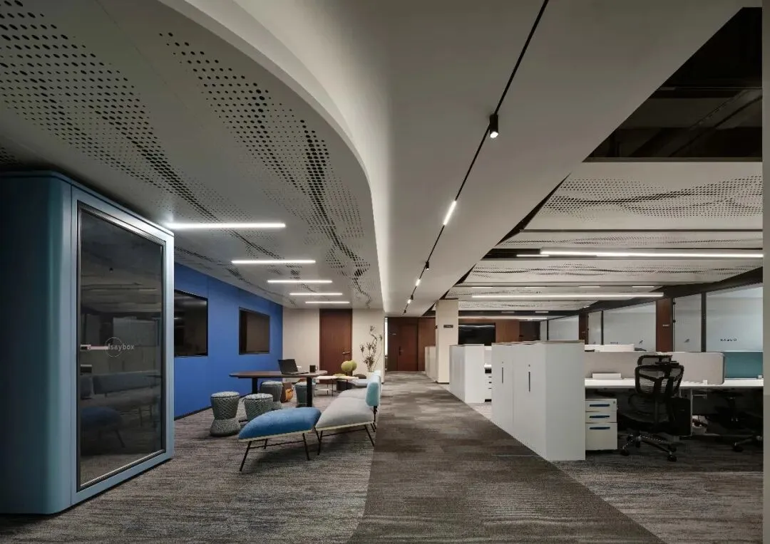 以开放式工位为核心,搭配穿孔铝板吊顶,既优化声学环境,又以点状纹理模拟海浪,呼应航运主题;灵活划分休闲洽谈区,以软质沙发、趣味座椅,打造员工交流、放松的“甲板休息区”;玻璃隔断会议室保障空间通透,实现“开放与私密”的平衡,激发团队协作活力。