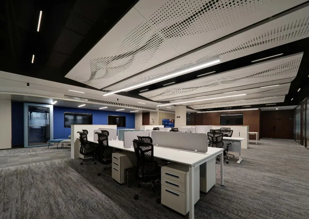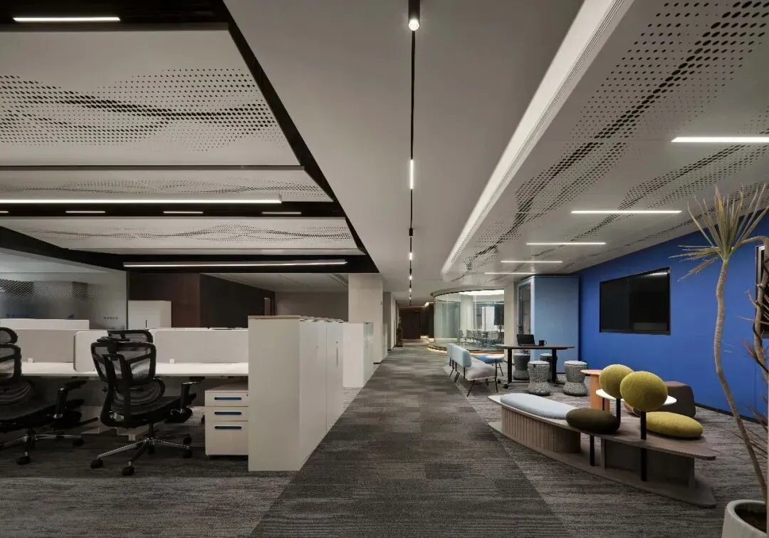With open workstations as the core and perforated aluminum panel ceilings, the acoustic environment is optimized while the dotted texture simulates waves, echoing the theme of shipping; Flexibly divide the leisure negotiation area, using soft sofas and fun seats to create a "deck rest area" for employees to communicate and relax; The glass partition conference room ensures spatial transparency, achieves a balance between openness and privacy, and stimulates team collaboration vitality.
