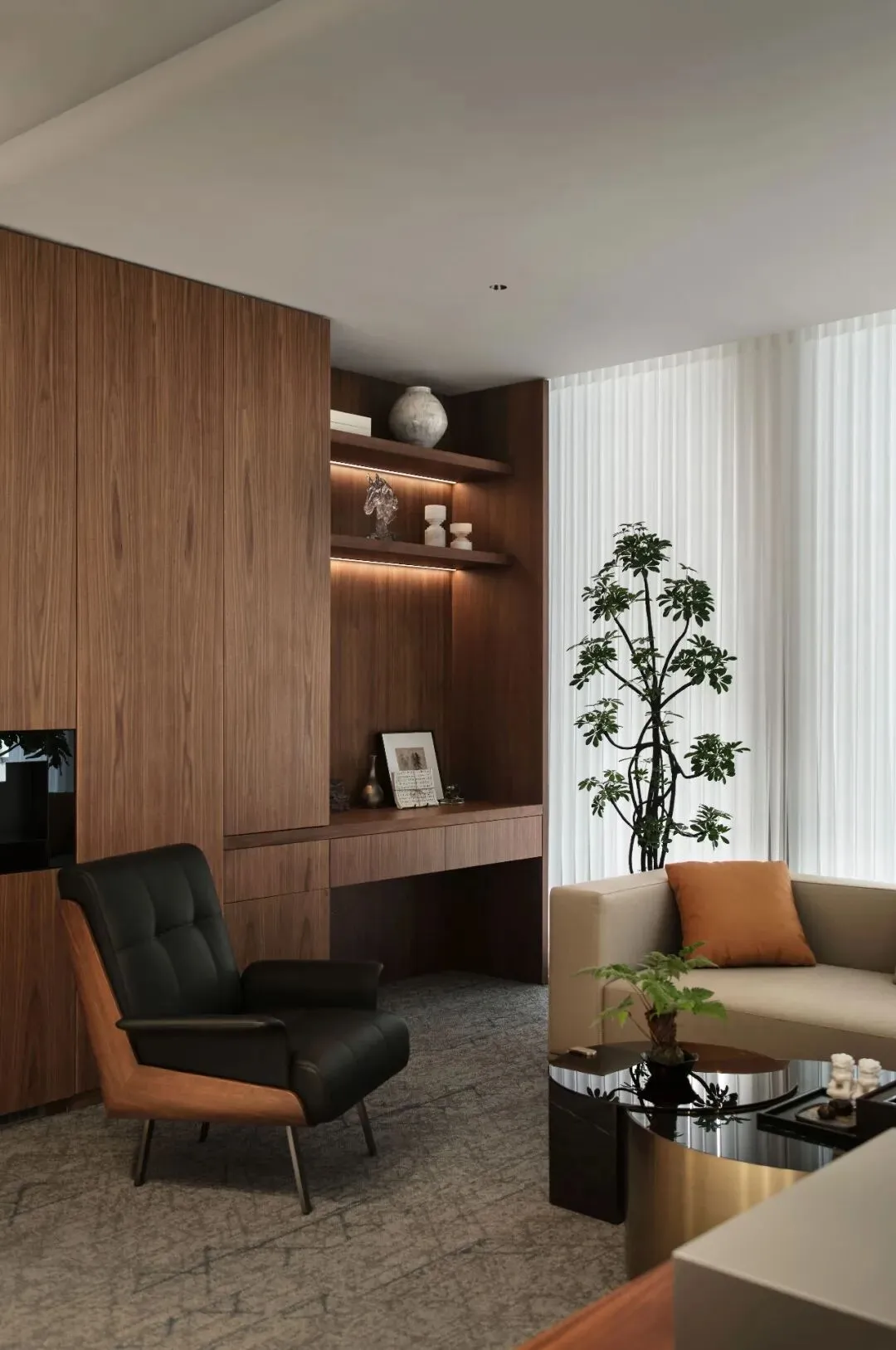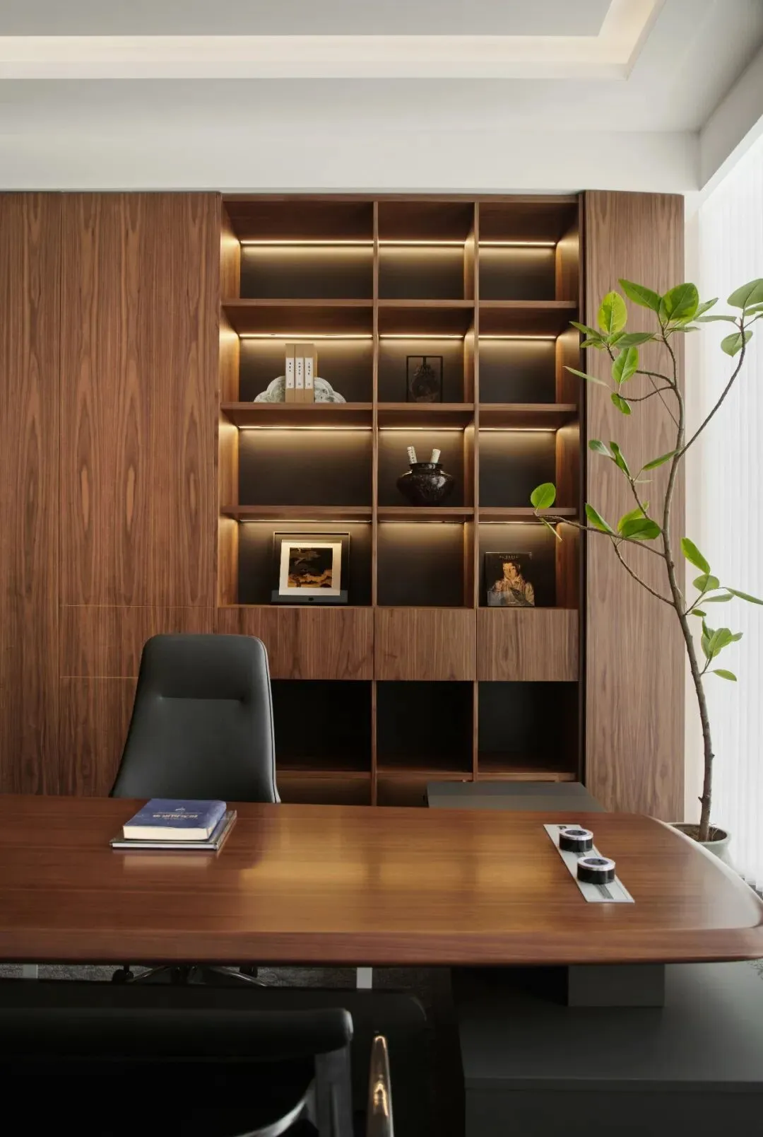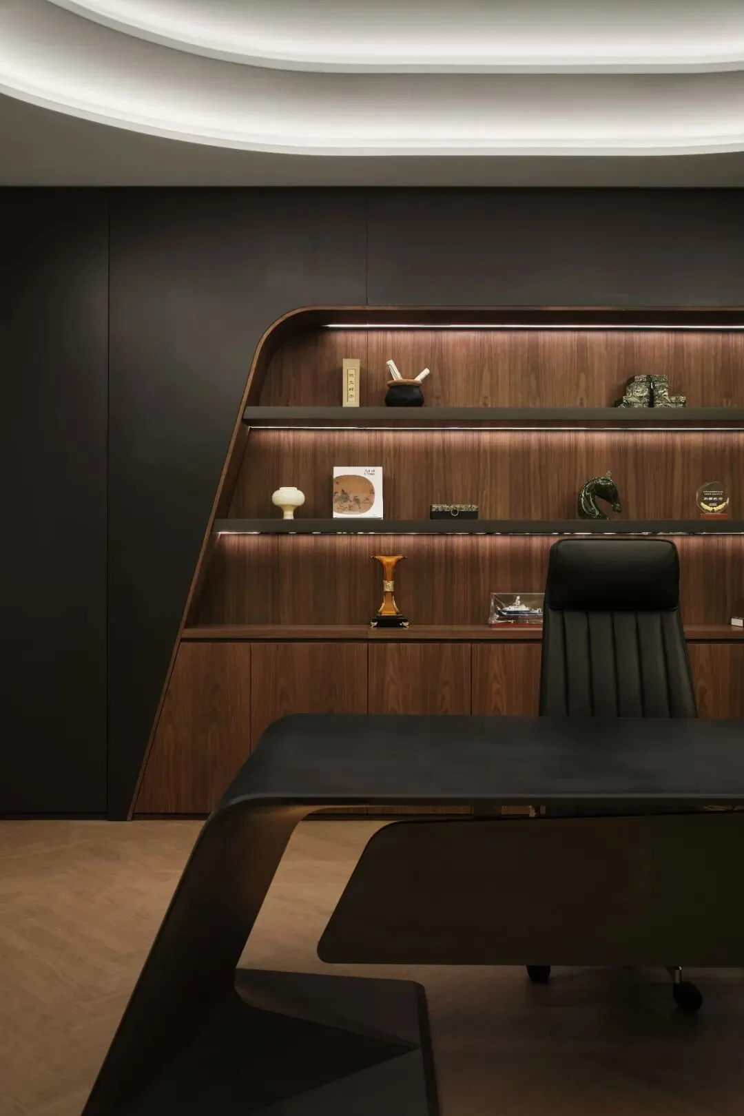Creating a tranquil atmosphere with curved ceilings and soft lighting, the oversized desk is paired with a full wall bookshelf to showcase the decision-making aura of executives; The leisure and reception area features warm sofas and elegant soft furnishings, creating a comfortable space for business negotiations and private communication; Planting green plants throughout the entire space to relieve office pressure with natural greenery, achieving the dual needs of "efficient office and physical and mental relaxation", and calmly controlling the overall situation like a "captain's cabin".