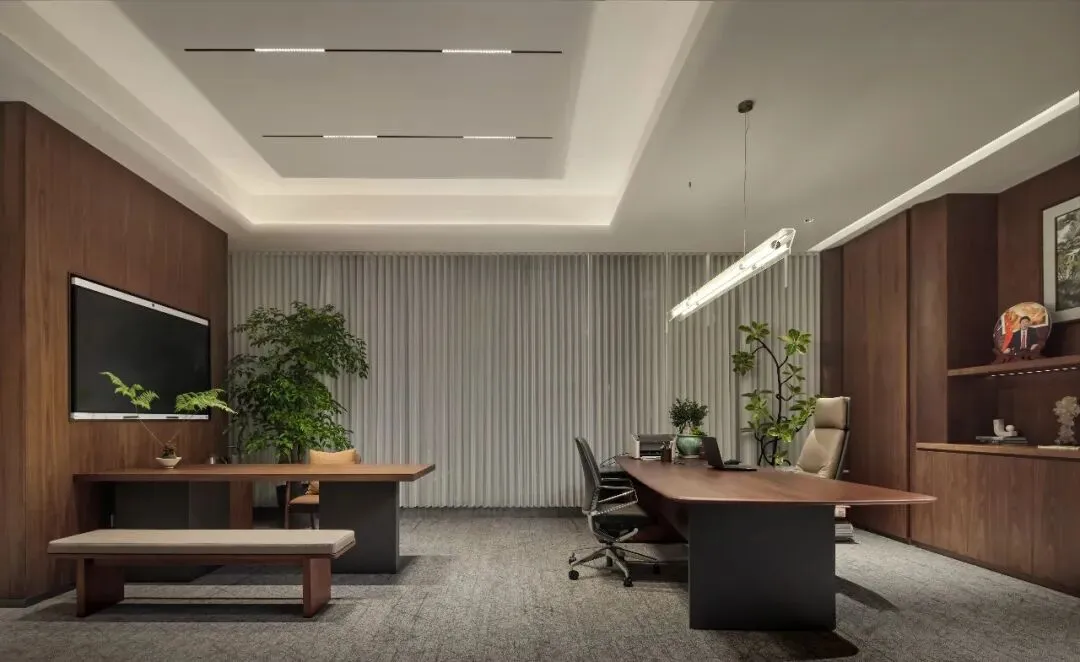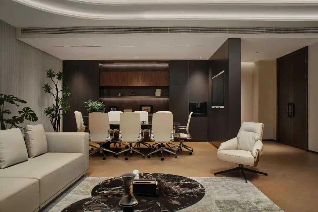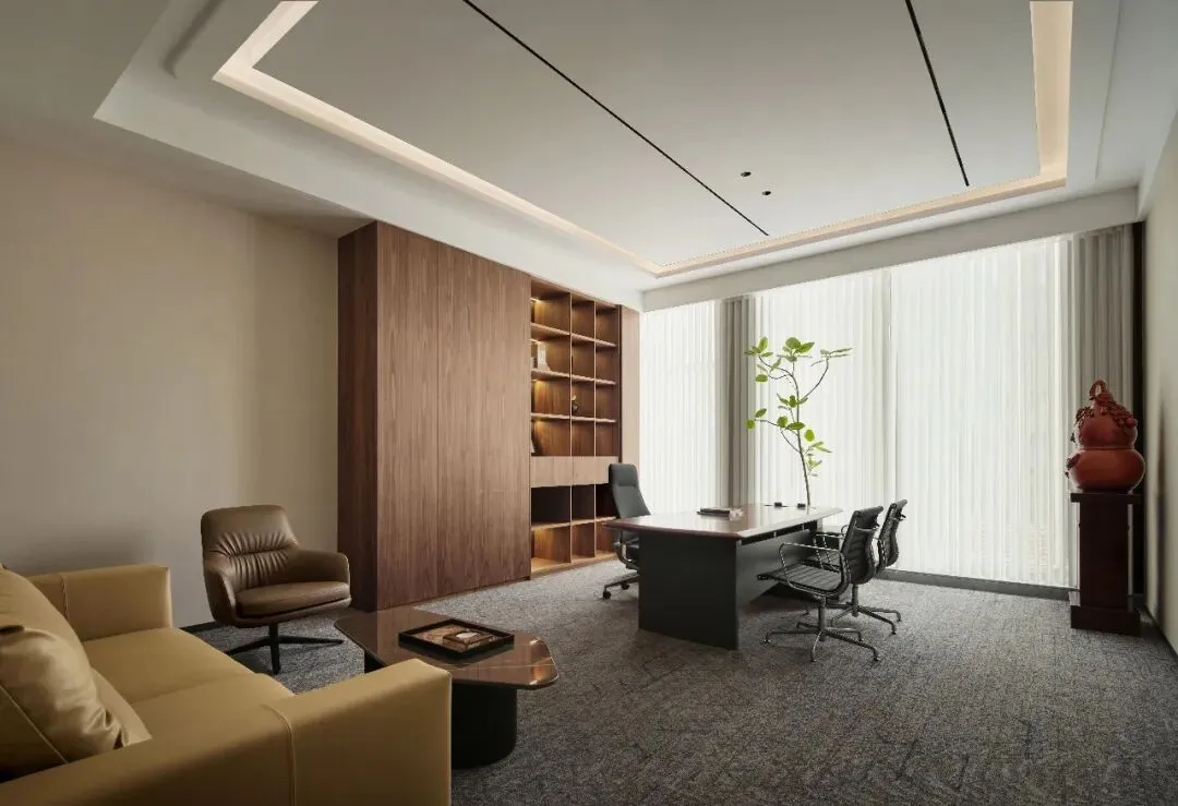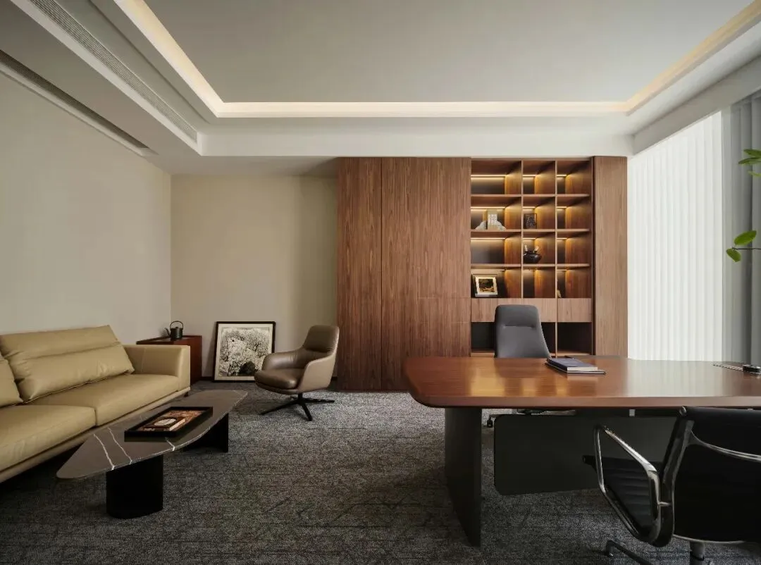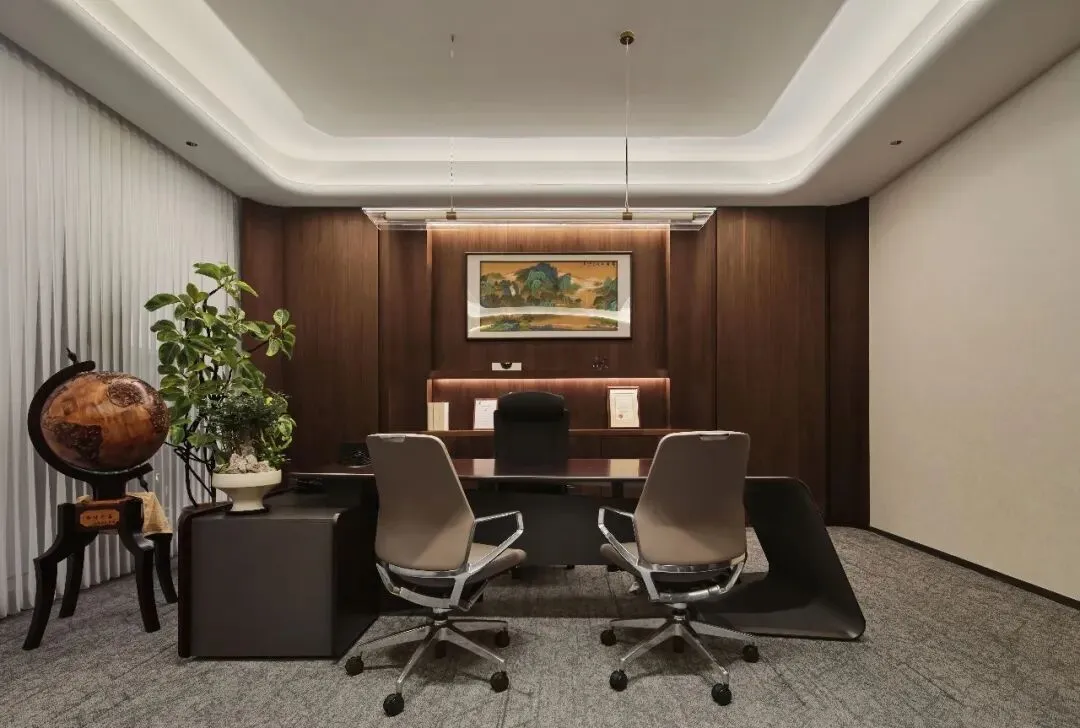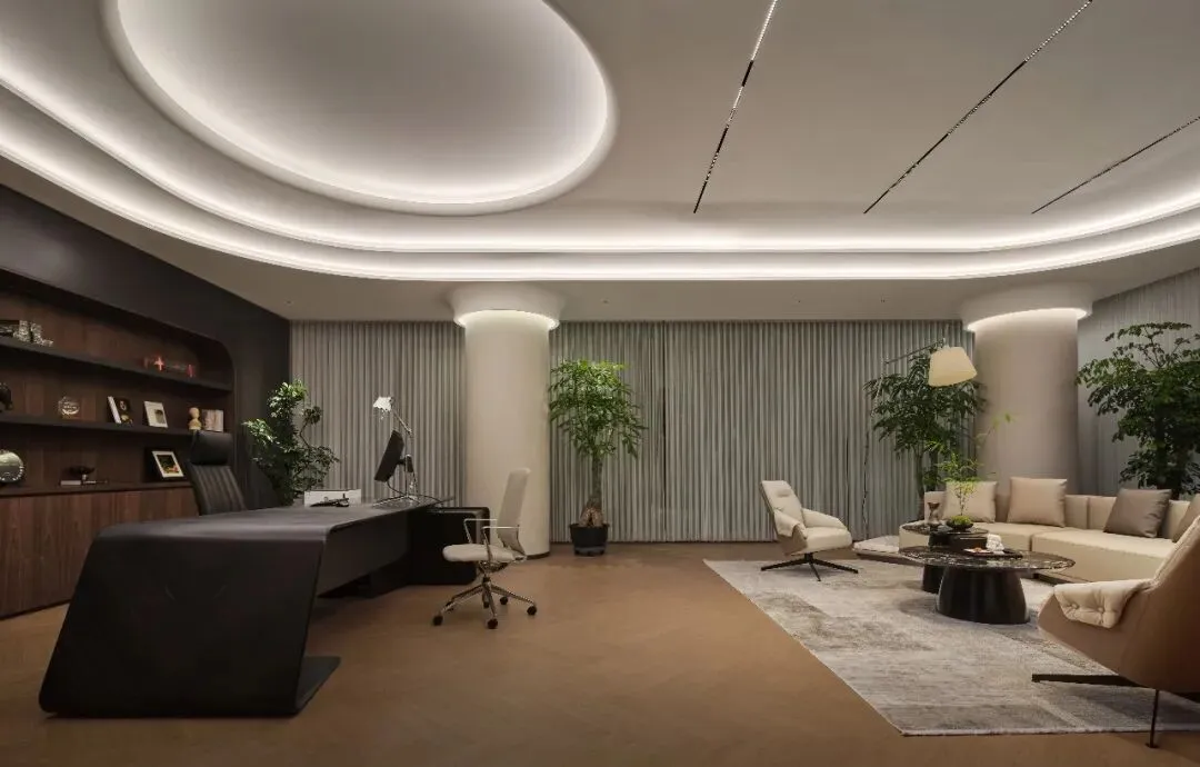 以弧形吊顶、柔和灯光营造静谧氛围,超大班台搭配整墙书柜,彰显高管的决策气场;休闲会客区以温润沙发、雅致软装,打造商务洽谈、私密沟通的舒适空间;全空间植入绿植,以自然绿意缓解办公压力,实现“高效办公与身心放松”的双重需求,如“船长室”般从容掌控全局。