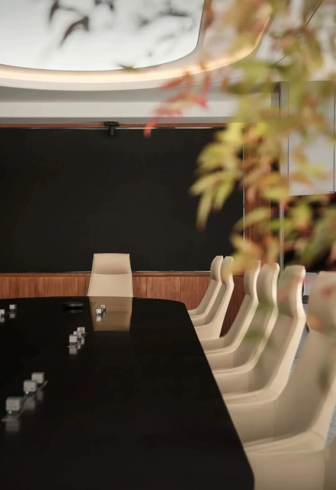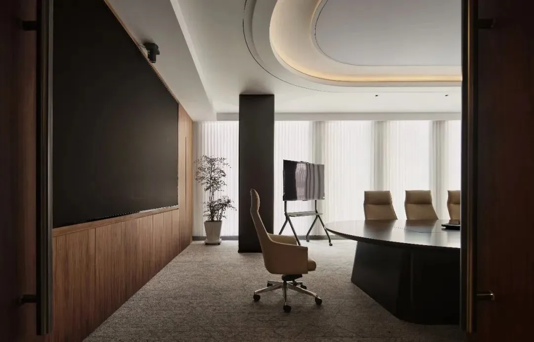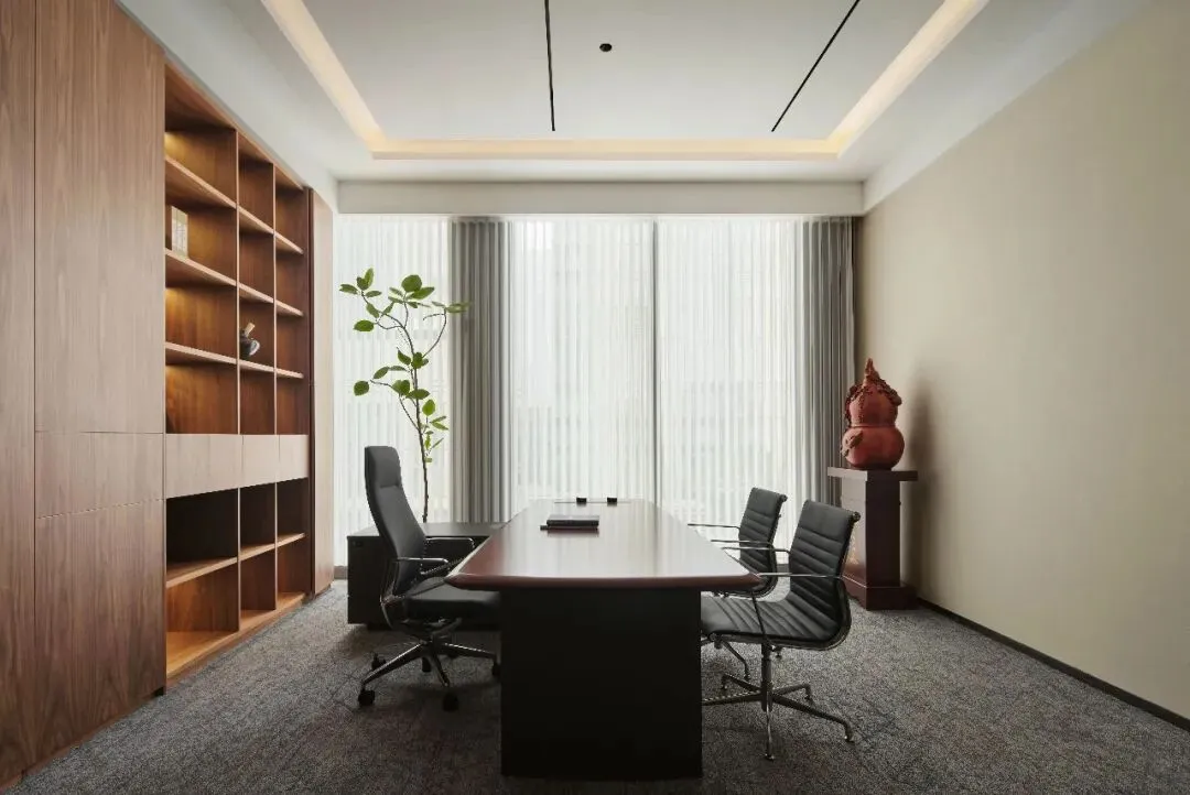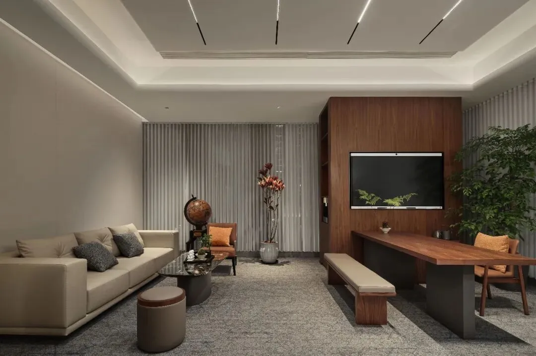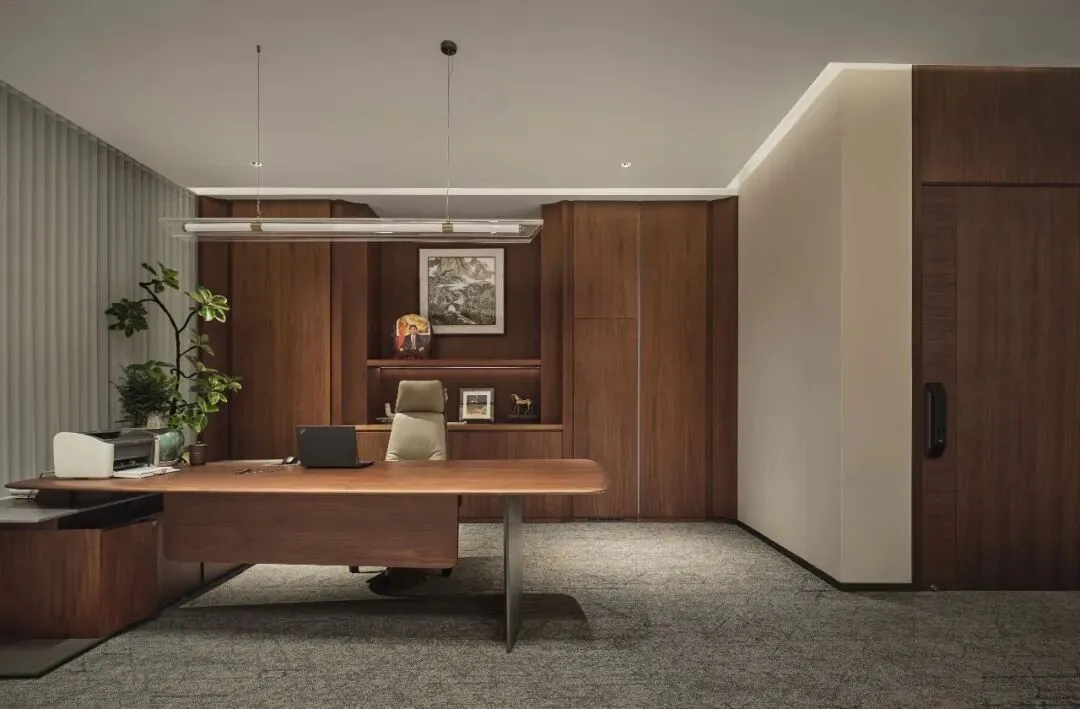 以弧形吊顶、柔和灯光营造静谧氛围,超大班台搭配整墙书柜,彰显高管的决策气场;休闲会客区以温润沙发、雅致软装,打造商务洽谈、私密沟通的舒适空间;全空间植入绿植,以自然绿意缓解办公压力,实现“高效办公与身心放松”的双重需求,如“船长室”般从容掌控全局。
