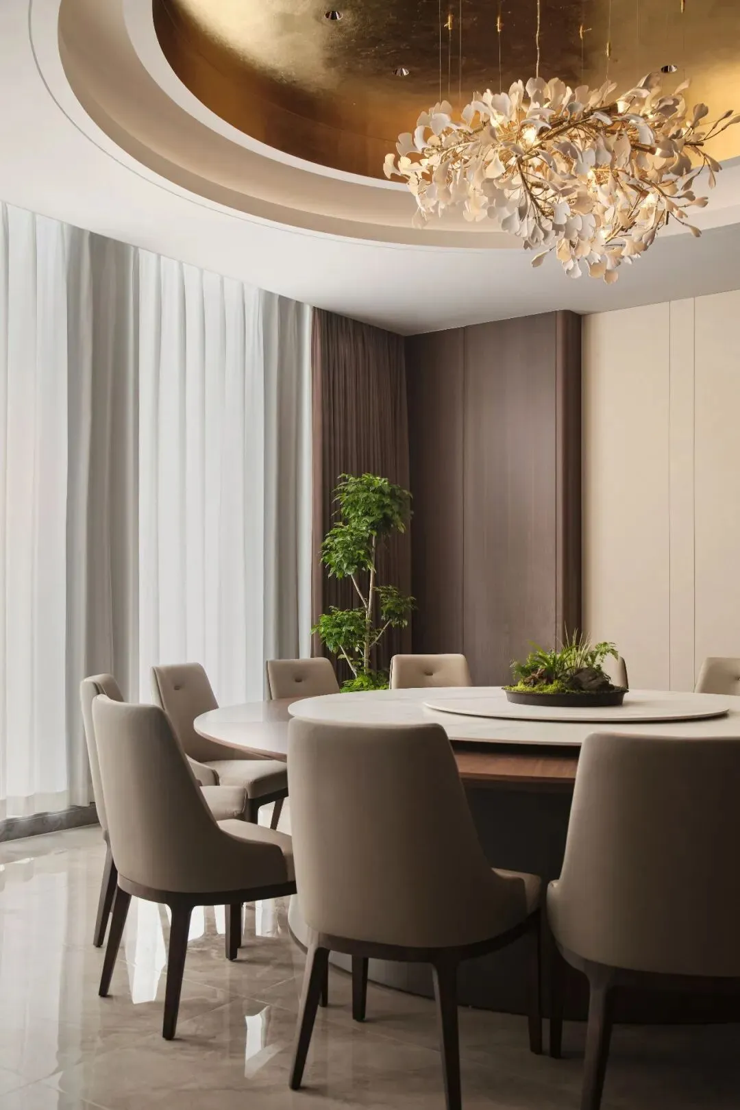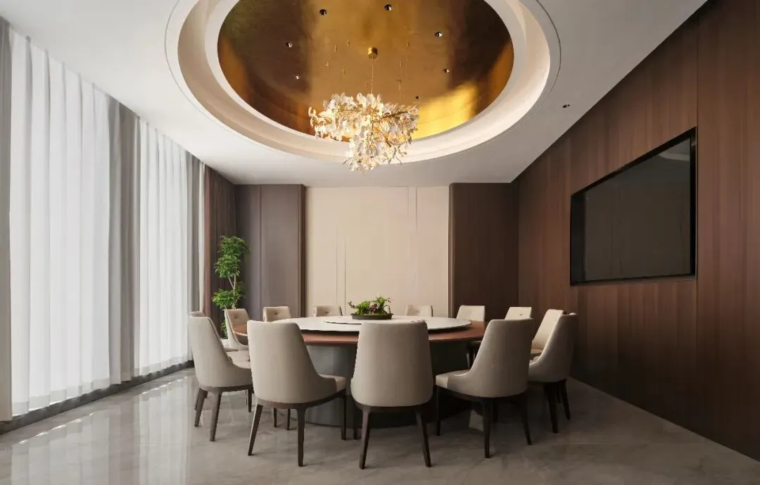 Employee canteen: Creating a bright and transparent dining space with modern and minimalist design, the curved dining table is paired with ambient lighting to convey a sense of belonging to the "warm harbor". The slogan "canteen is a warm harbor, food is a concern for long-distance travel" integrates corporate care into details; VIP restaurant: Creating a luxurious atmosphere with gold foil circular ceilings and artistic chandeliers, elegant soft furnishings and green plant landscaping, showcasing the high-end reception style of the enterprise, suitable for business banquets and important receptions, and conveying the brand strength of the enterprise.