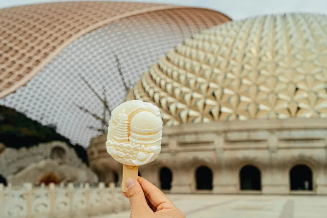文创雪糕,可可爱爱,深得我心。雪糕中间,是极具代表性的佛顶宫和佛顶塔,映衬着下方波光粼粼的水面和代表佛家的莲花,将巍峨的牛首山捧在手心。眼下去牛首山,不仅可以牛奶味、巧克力味、草莓味三选一,还能get新款金陵小城雪糕哦。金陵名胜,犹以牛首春色为最。
