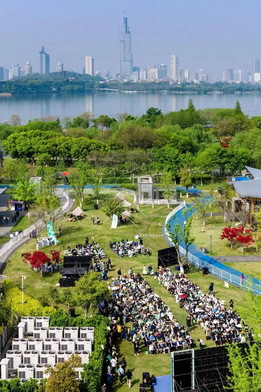 玄武湖畔金陵STYLE的户外草坪上到处都是人,大家露天搭起帐篷,摆开露营椅和懒人沙发,甚至直接席地而坐,与身边的人自在交谈。不知道的话,会以为是闯入了某个音乐节。