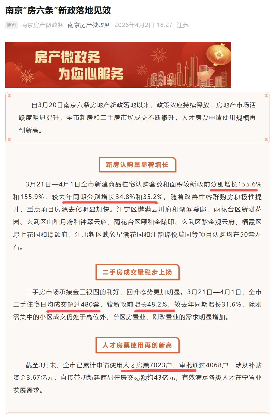 3月20日 ,南京发布“宁六条”楼市新政,包括南京进一步鼓励住房消费“以旧换新”:即日起至2026年12月31日期间,购房人挂牌卖二手房、按揭买新房,就可享受贷款金额1%的贴息补助,全市限额1亿元,先申先得、完税后返息;