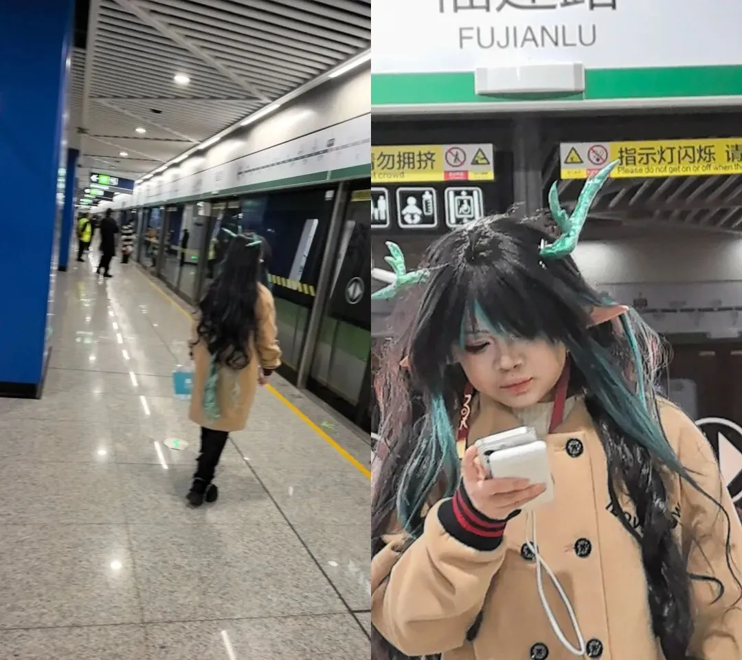 坐地铁去南湖,需要在福建路站换乘。刚走到站台,一个身影就抓住了我的目光:长长的黑绿渐变卷发,头顶青绿色的龙角,精灵耳俏皮地立着,一身卡其色大衣裹着,低头看着手机的样子,像是从游戏里走出来的角色。