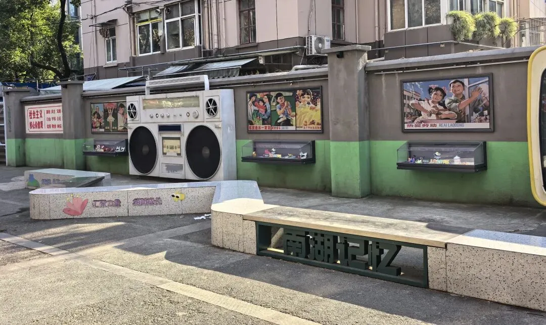 循着路往前走,一面充满年代感的围墙突然闯入视线——这就是大名鼎鼎的「南湖记忆」文化墙。巨型的老式收音机、复古电视机造型装置立在墙边,墙上贴满了80、90年代的宣传画,「科学的未来 祖国的希望」「热爱劳动」的标语,瞬间把人拉回了小时候的时光。