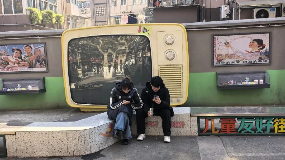 长凳上,两个年轻人低头刷着手机,复古的背景和现代的生活,在这一刻完美融合。这面墙不仅是南湖的文化名片,更是南京城市更新里的温柔一笔,把老南湖的记忆,好好地留在了街巷里。