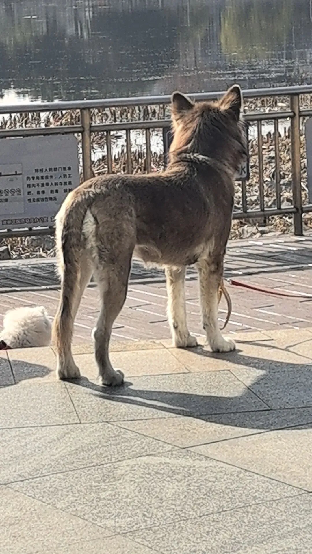 饱餐一顿后,到附近的公园消食。阳光正好,微风不燥,湖边的芦苇还带着冬日的余韵,一只大狗安静地站在护栏边,背对着镜头望向湖面,背影威风又温柔。