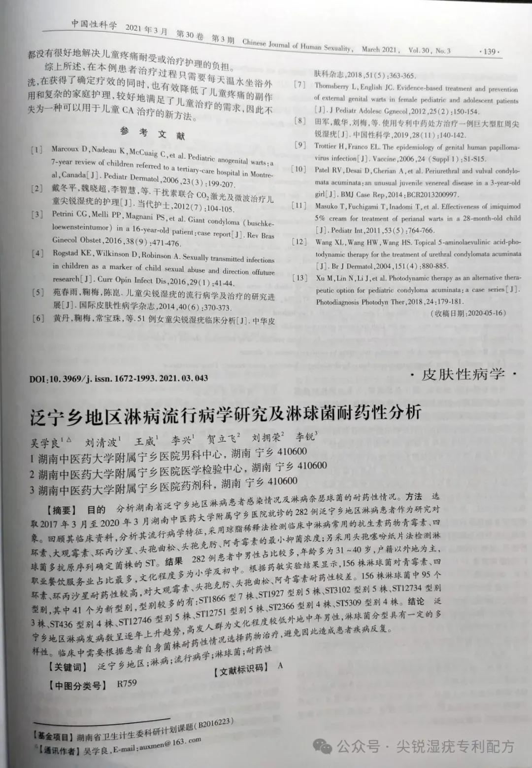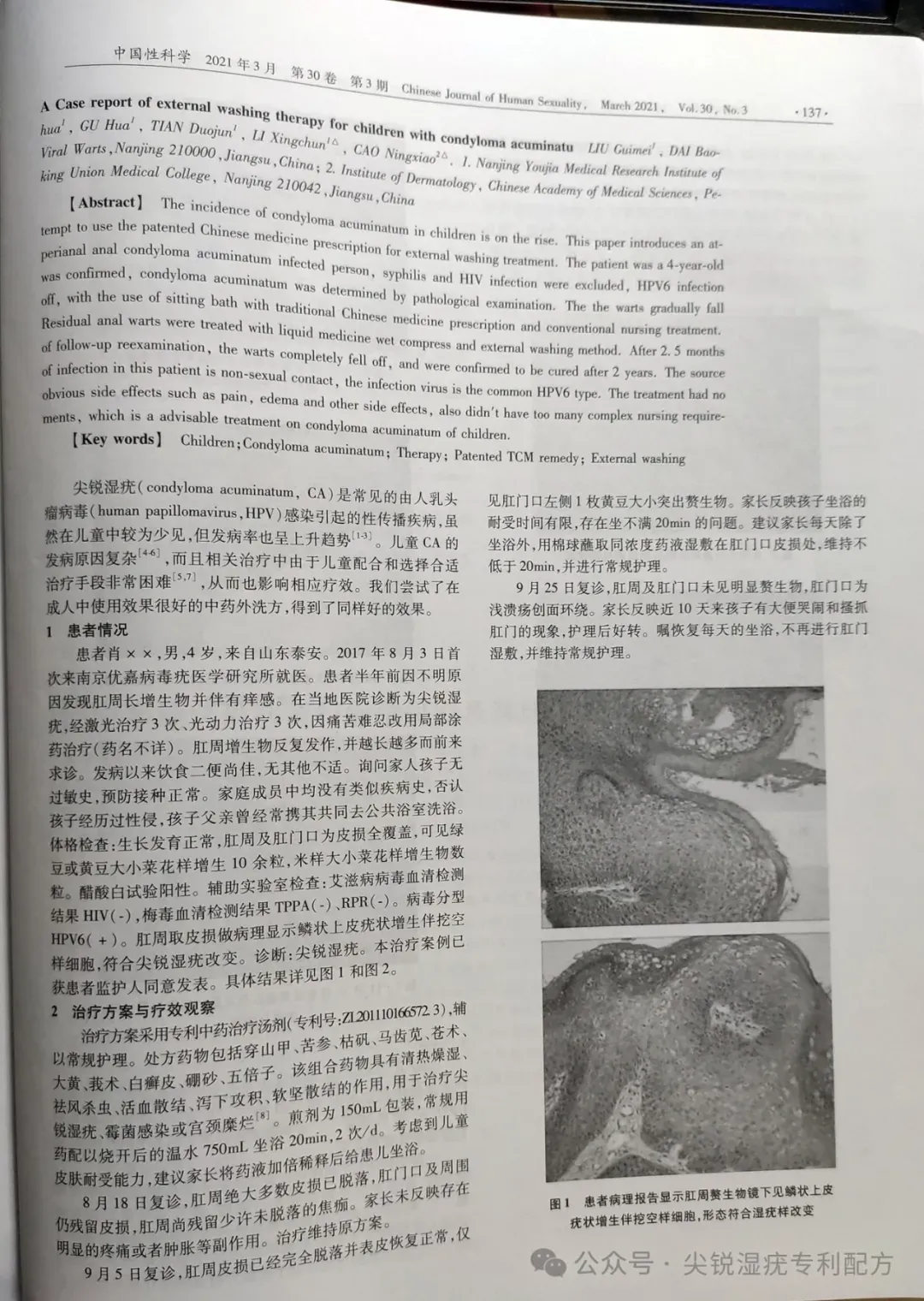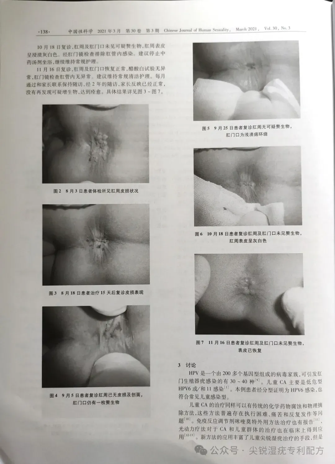 该专利组方应用于临床治疗20多年,不仅帮助了数以万计的复发患者解决困扰,还被医学书籍《尖锐湿疣的诊治》收录在册,并两次在核心医学期刊《中国性病科》上发表多篇学术论文。在2019年11月第28卷第11期《中国性科学》杂志中发表了一篇名为《使用专利中药处方治疗一例巨大型肛周尖锐湿疣》的学术性论文;在2021年3月第30卷第3期《中国性科学》杂志中发表了一篇名为《儿童尖锐湿疣的外洗新疗法1例报告》的学术性论文。详情如下图所示: