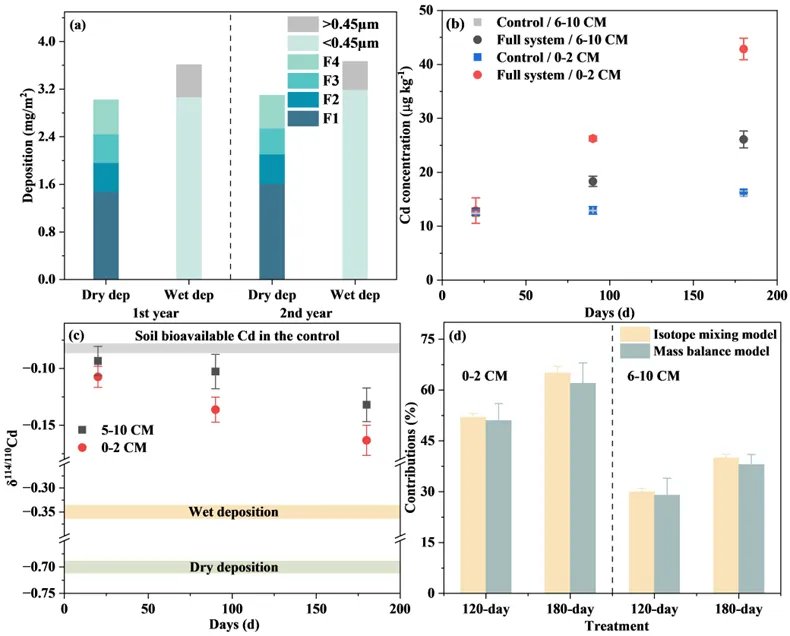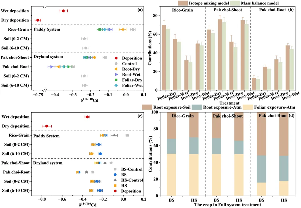 为了阐明不同大气沉降类型、作物暴露途径和土壤类型对土壤-作物系统的影响,在中国最大的铜冶炼厂周围的定制开顶式气室中进行了为期两年的连续原位大气暴露实验。同时,结合温室实验,确定了大气干、湿沉降在土壤中的老化过程、以及通过叶面和根部暴露被作物富集过程中的Cd同位素分馏因子,为同位素混合模型的优化提供修正参数。结果表明,大气沉降中生物可利用Cd在土壤中老化过程以及在作物中吸收转运过程的分馏程度由大气沉降的生物可利用Cd的同位素组成决定,而与其形态变化无关。图2.大气沉降通量(a)、不同处理下土壤生物可利用Cd浓度(b)及同位素组成(c)以及质量平衡模型和同位素混合模型计算的大气沉降对土壤生物可利用Cd的贡献(d)。
