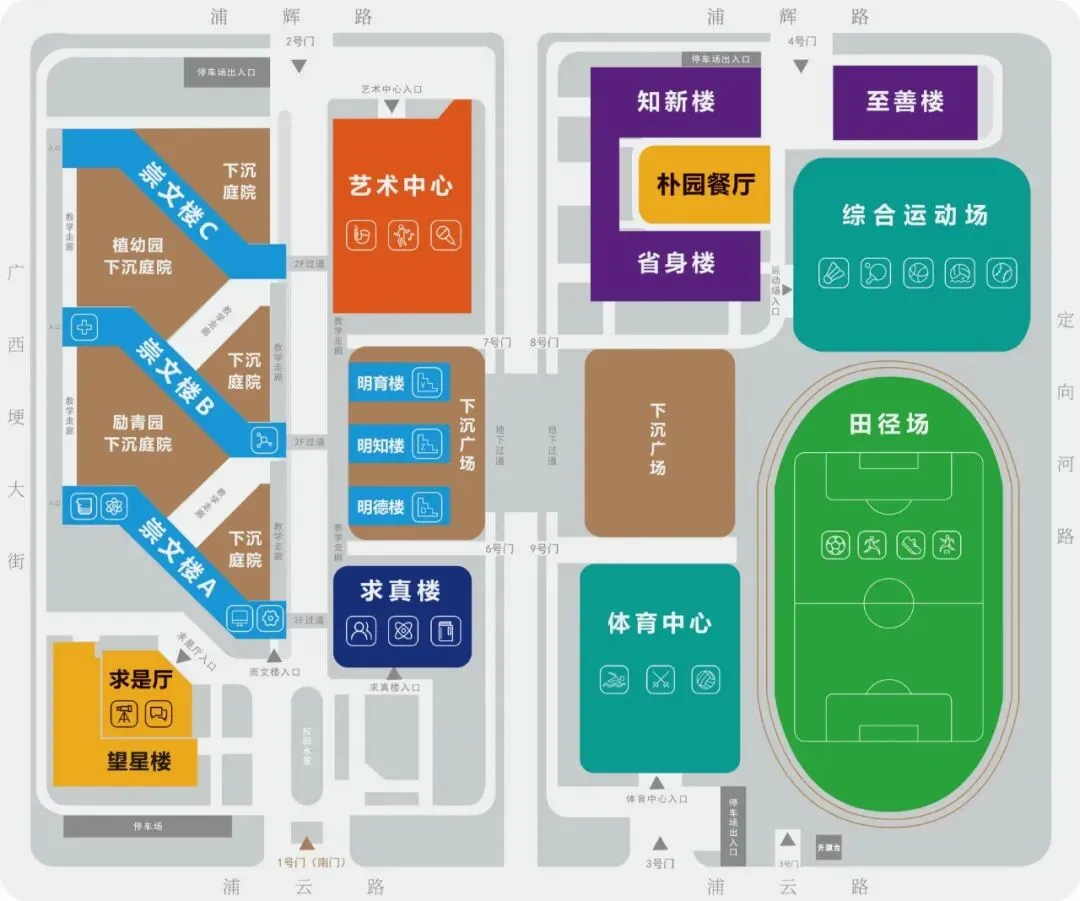 2.北校区可免费停至学校地下停车场(浦云路64号3号门旁地下停车场)。
