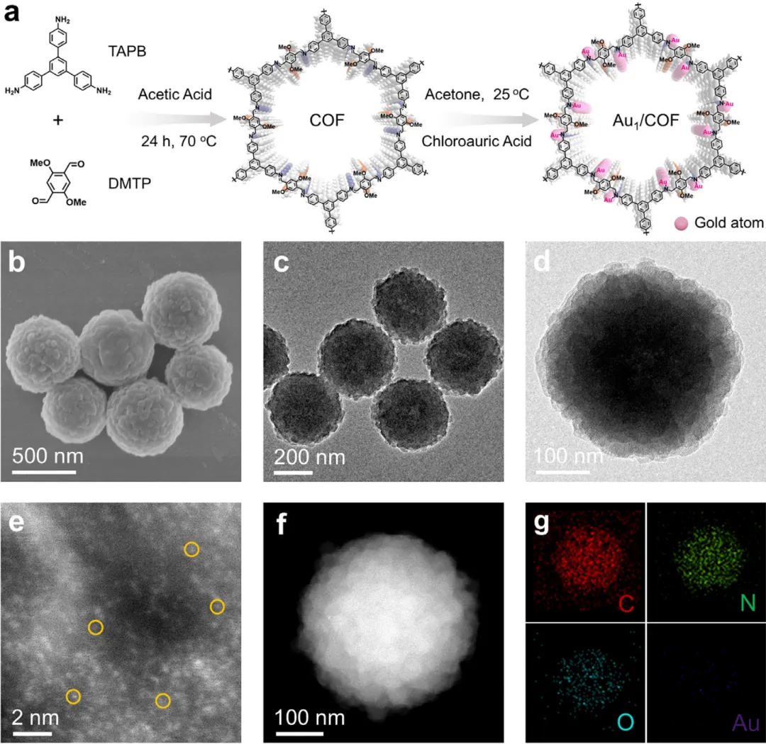 图1 | 催化剂的合成路线和形貌结构。(a) Au₁/COF复合材料的合成路线示意图。(b) 所制备Au₁/COF的SEM图像。(c) Au₁/COF的TEM图像。(d) Au₁/COF的放大TEM图像。(e) Au₁/COF的像差校正HAADF-STEM图像。(f, g) Au₁/COF的HAADF-STEM图像及对应的C、N、O和Au元素的EDX元素面分布图。