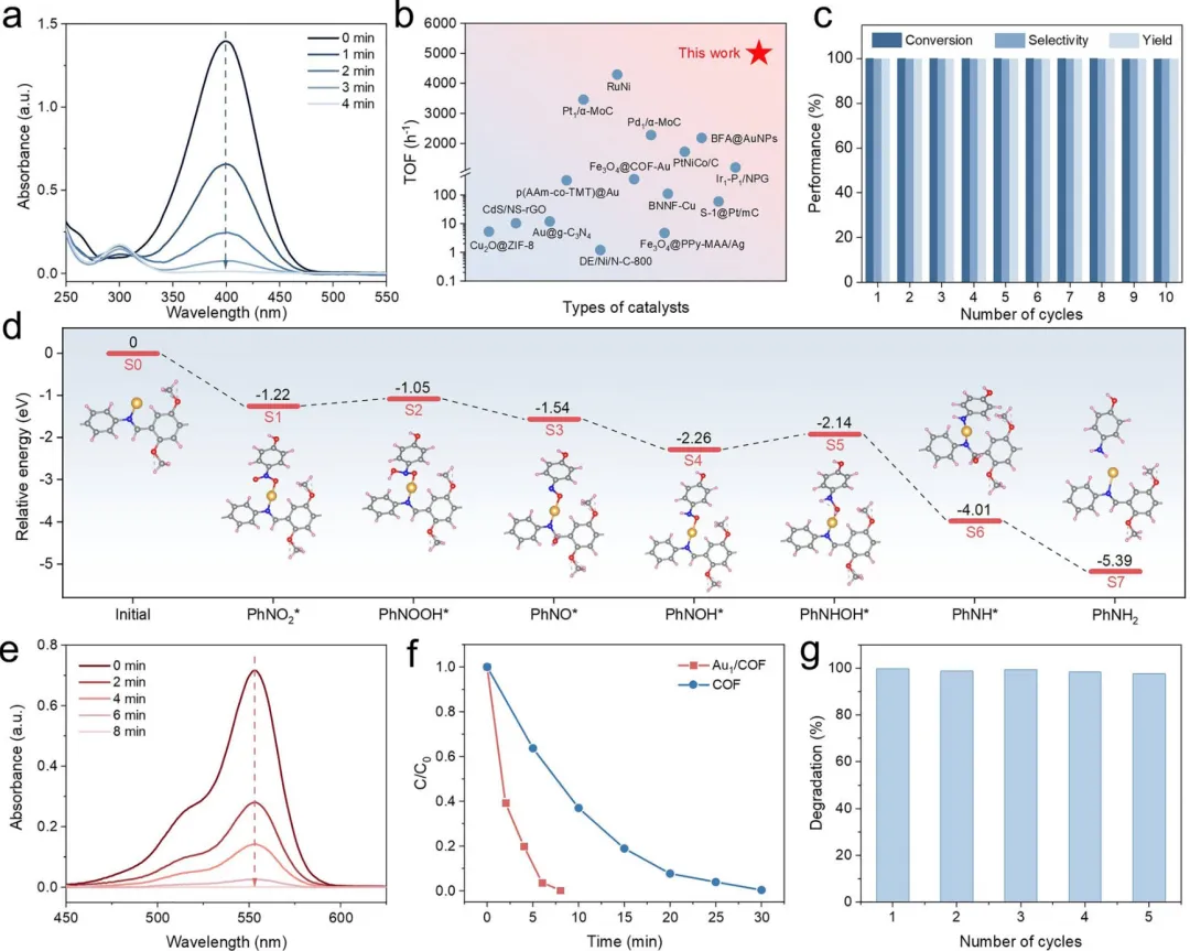 所制备的Au₁/COF单原子催化剂在硝基芳烃(如对硝基苯酚)加氢反应中表现出卓越的催化性能,其转换频率高达5000 h⁻¹,且对多种硝基芳烃加氢制芳胺的选择性均超过99.9%。结合理论计算,这归因于单原子位点独特的电子结构优先吸附和活化-NO₂基团,同时催化剂在循环使用后仍能保持结构完整性与单原子分散,展现出优异的稳定性。