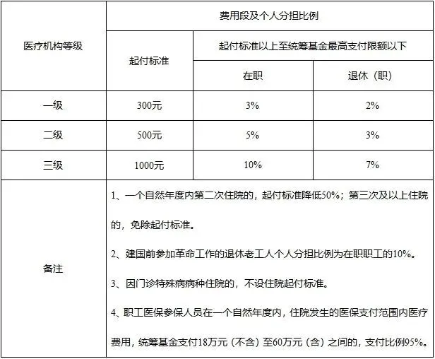 例:某退休参保人员今年首次住三级医院,住院总费用16000元,其中住院费用明细清单右栏个人自理(自付)部分为950元(是指乙类药品、诊疗项目、服务设施个人按比例负担部分和基本医疗保险范围外的费用)。